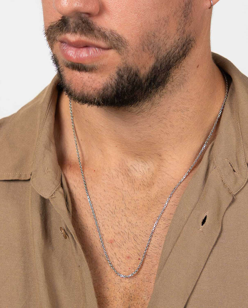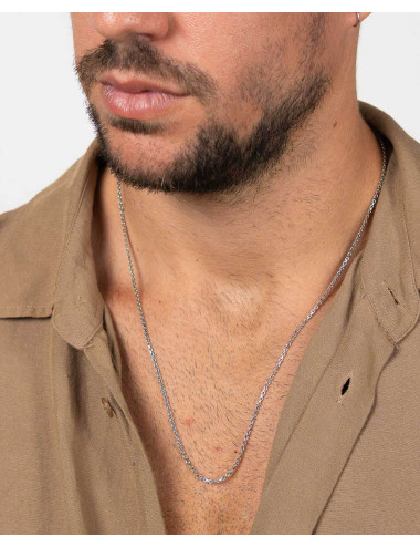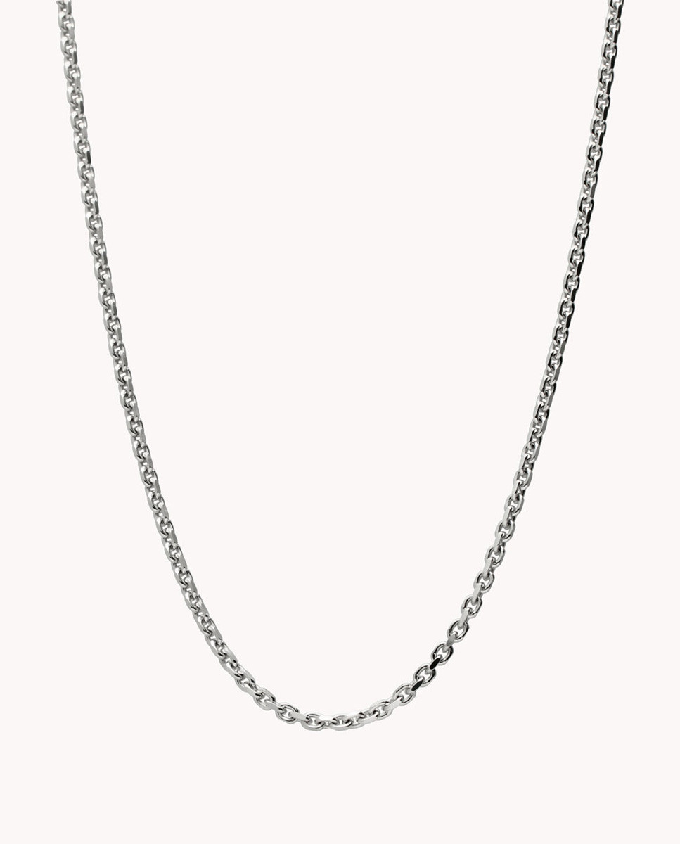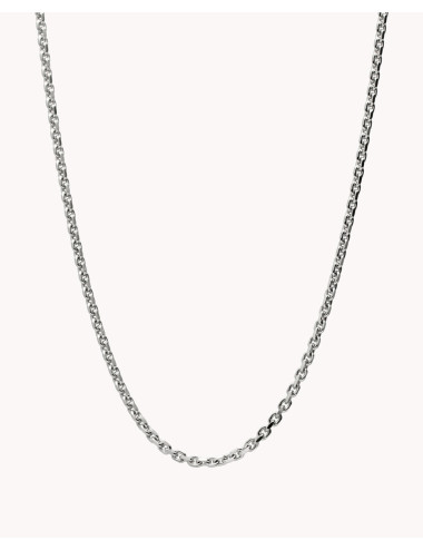 Cadena de plata de ley 925 bañada en rodio con eslabón tipo rolo diamantado en cuatro lados de 2 mm de ancho y 60 cms de largo, cierre de mosquetón.