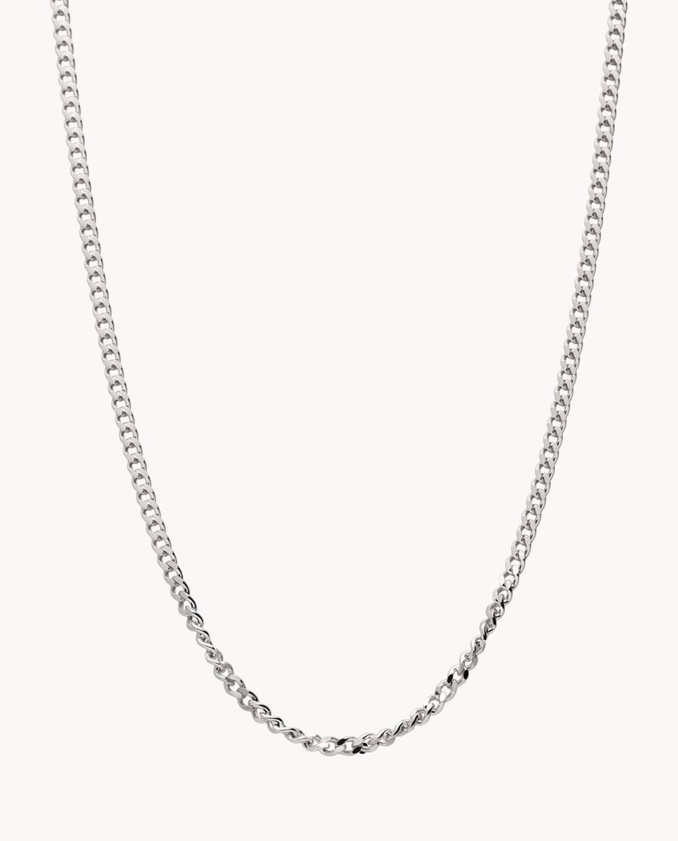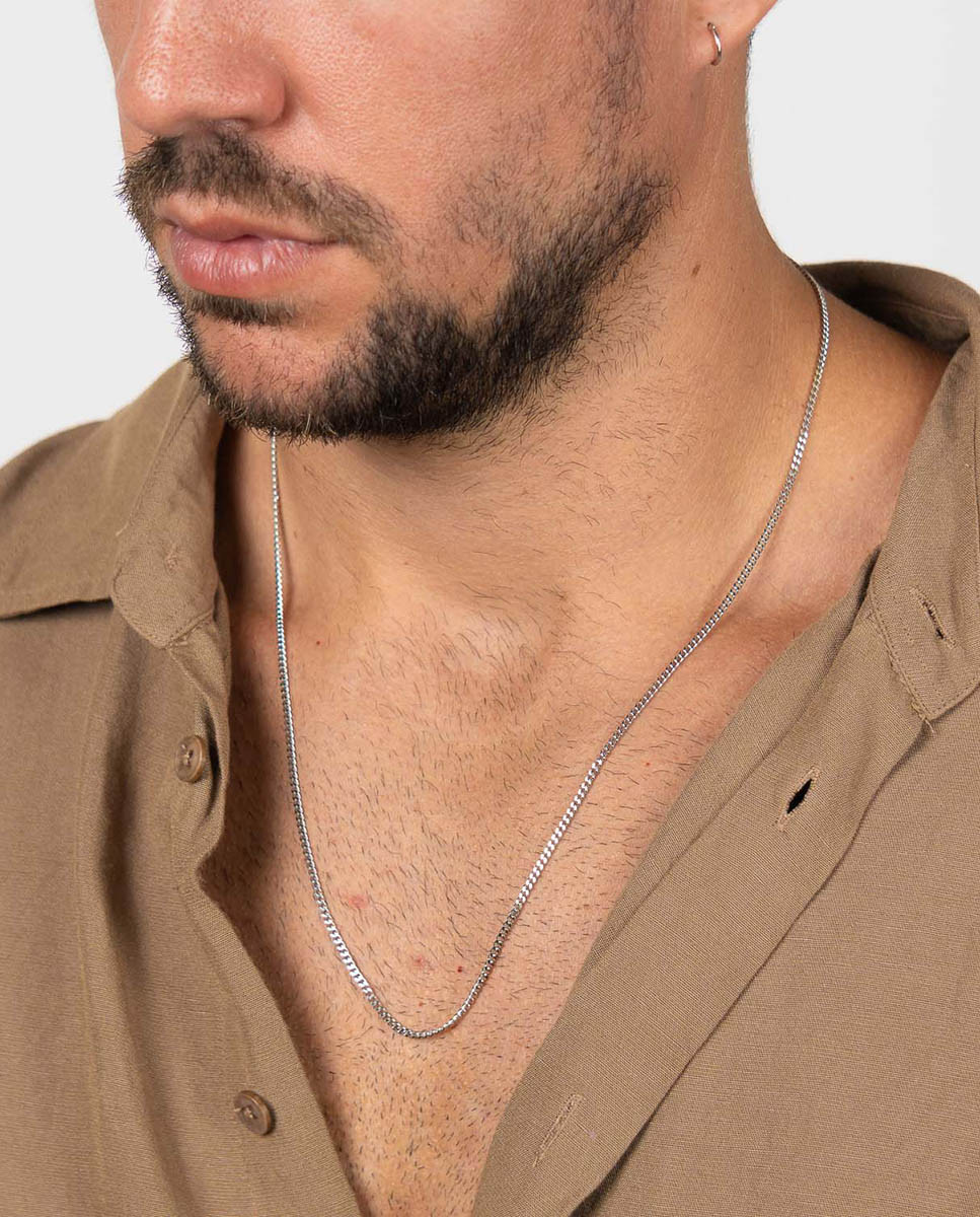 Cadena de plata de ley 925 bañada en rodio con eslabón tipo barbado de 2,12 mm de ancho y 60 cms de largo, cierre de mosquetón.