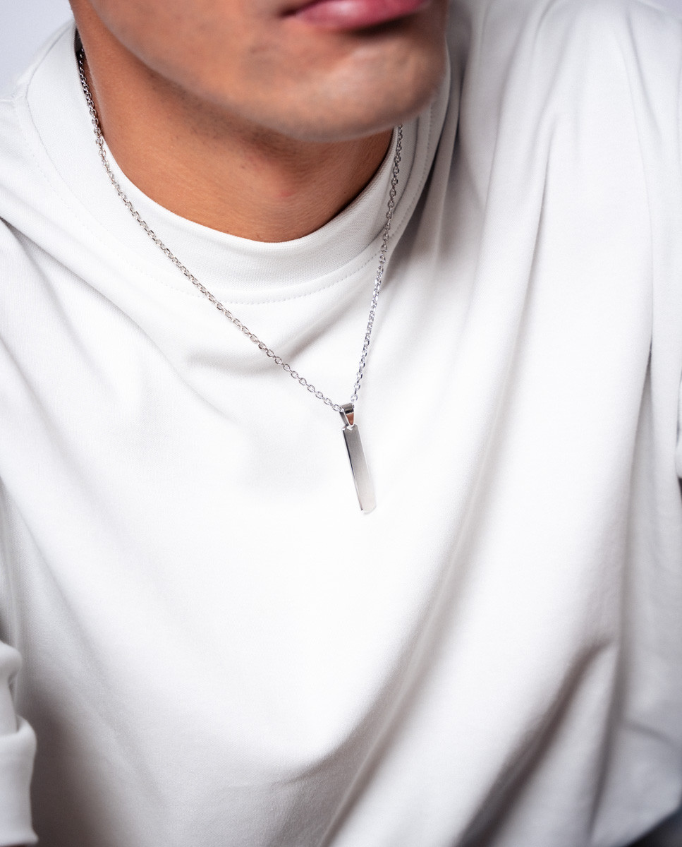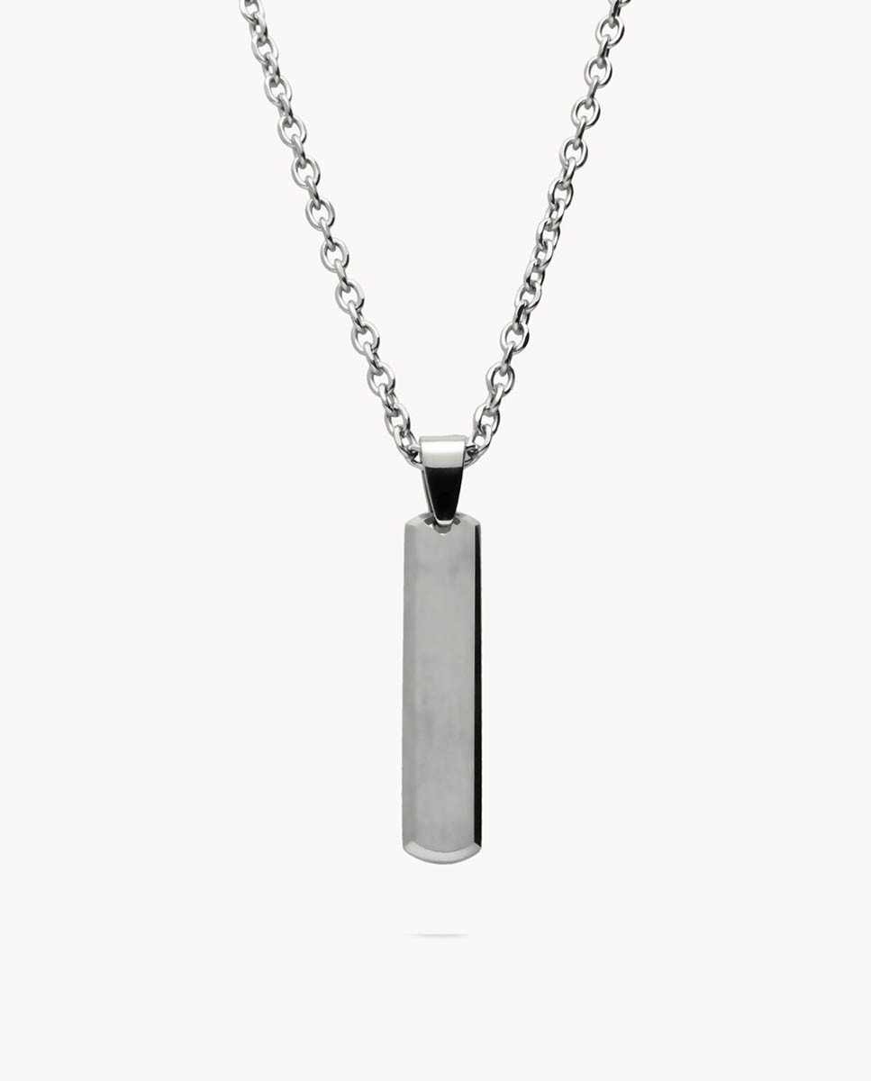 Colgante de acero inoxidable con barra vertical de 8 mm x 35 mm (ancho por alto). Cadena con largo de 45,5 cms más 5 cms de alargador y cierre de mosquetón.