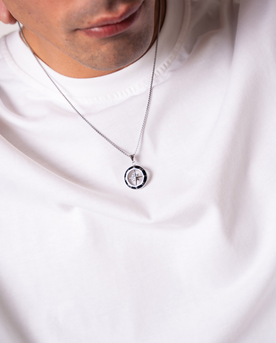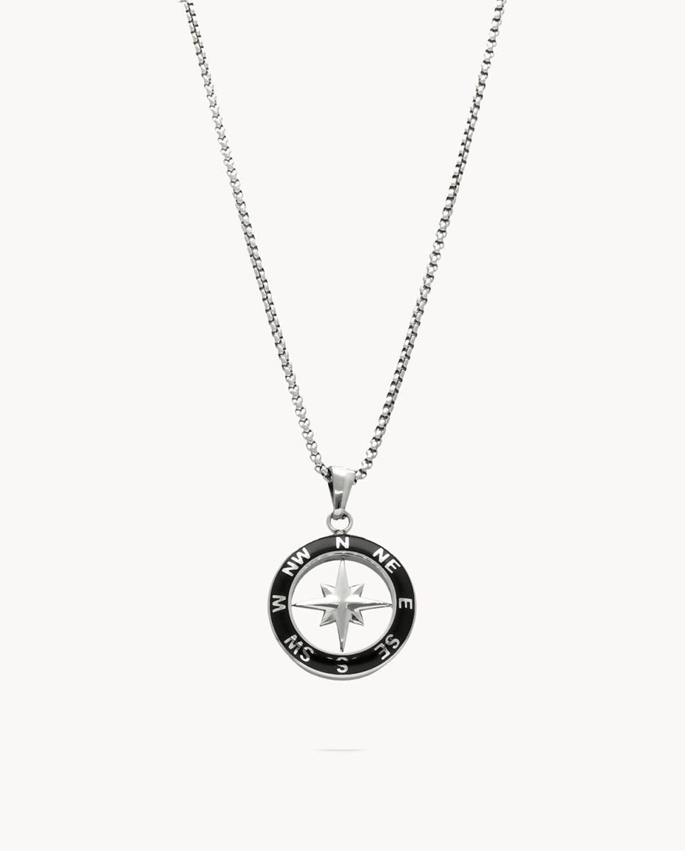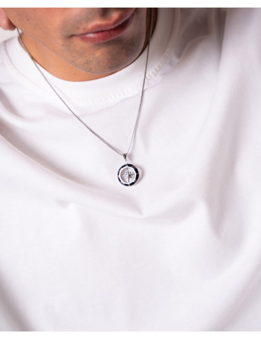 Colgante de acero inoxidable de 20 mm de diámetro con brújula esmaltada en negro y detalle central de rosa de los vientos, cadena de 50,5 cms de largo más 5 cms de alargador y cierre de mosquetón.