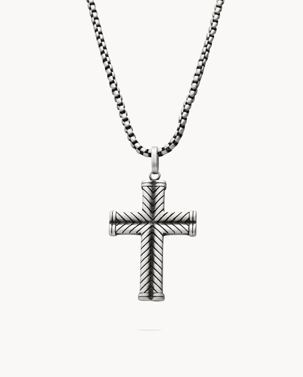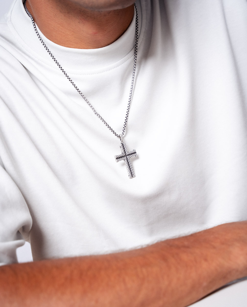 Colgante de acero inoxidable con acabado mate y cruz de 40 mm de largo por 28 mm de ancho. Cadena con cierre de mosquetón y largo a dos alturas (50 cms y 55 cms).