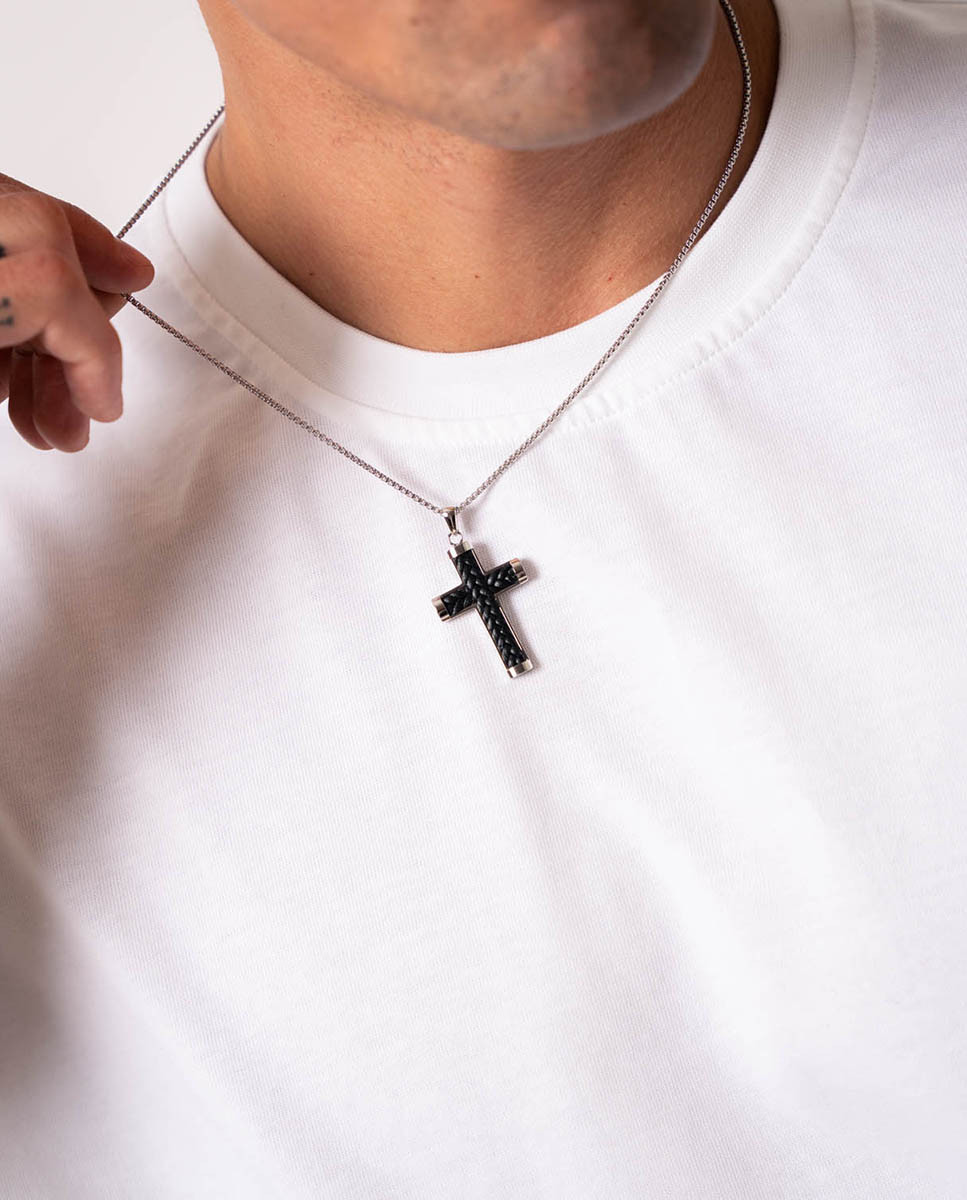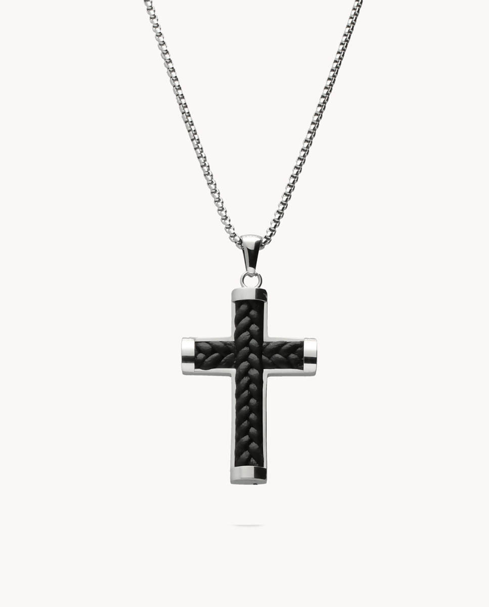 Colgante de acero inoxidable con cruz y detalle interior de cuero negro trenzado, 35 mm de largo por 24 mm de ancho. Cadena con cierre de mosquetón y largo a dos alturas (45 cms y 50 cms).