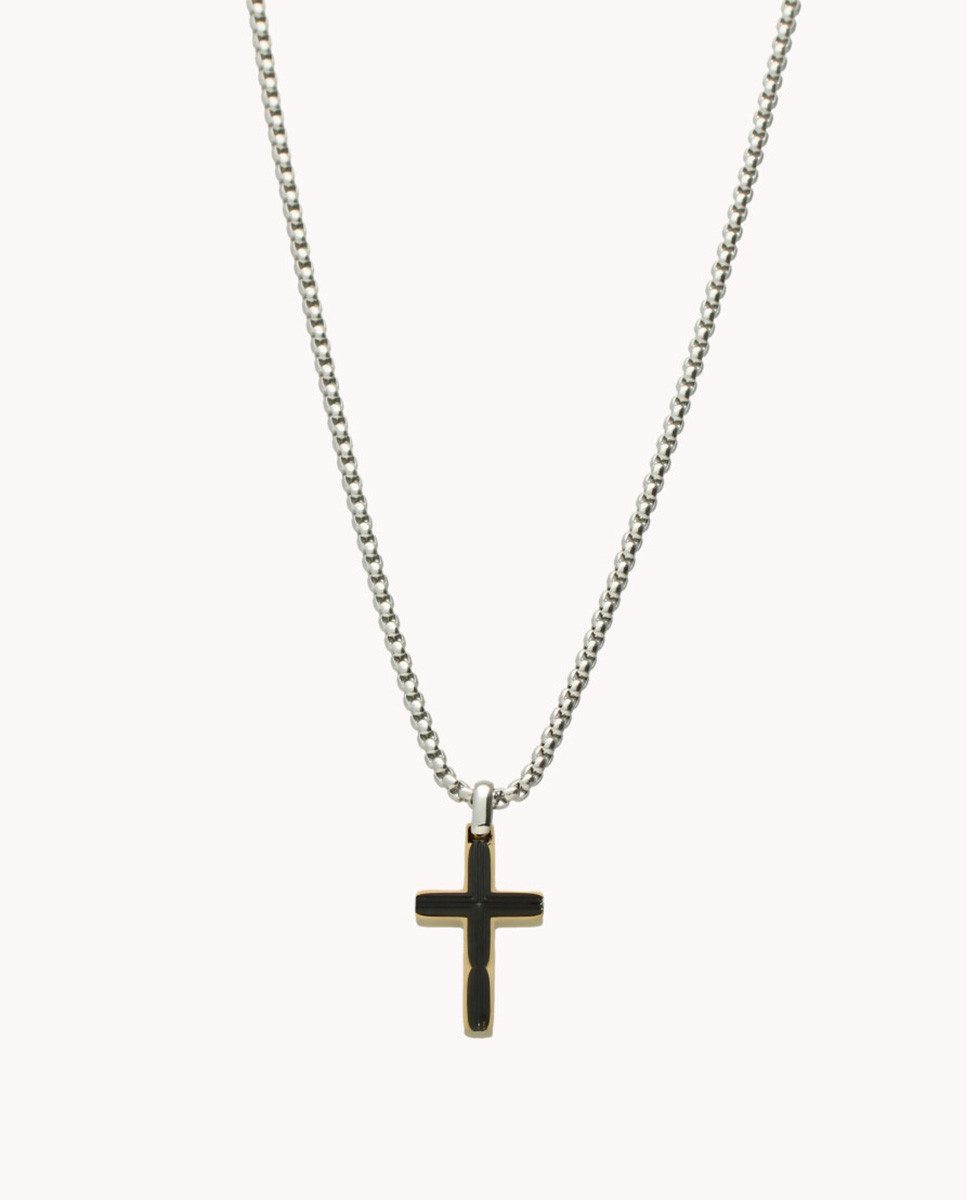 Colgante de acero inoxidable IP negro con cruz bicolor (IP negro e IP dorado) de 20 mm de largo por 11 mm de ancho. Cadena con cierre de mosquetón y largo a dos alturas (46 cms y 50 cms).