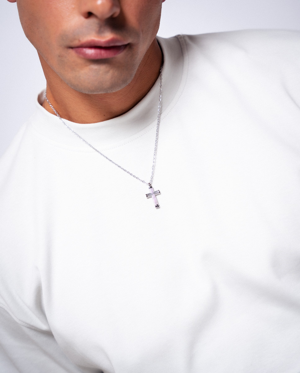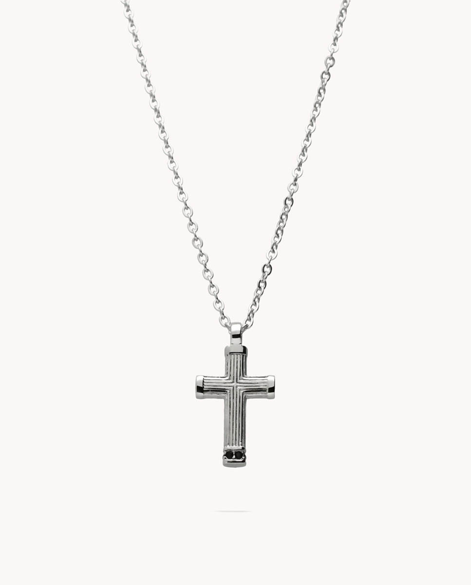 Colgante de acero inoxidable con cruz y circonitas negras en la parte inferior, 23 mm de largo por 19 mm de ancho. Cadena con cierre de mosquetón y largo a dos alturas (45 cms y 50,5 cms).