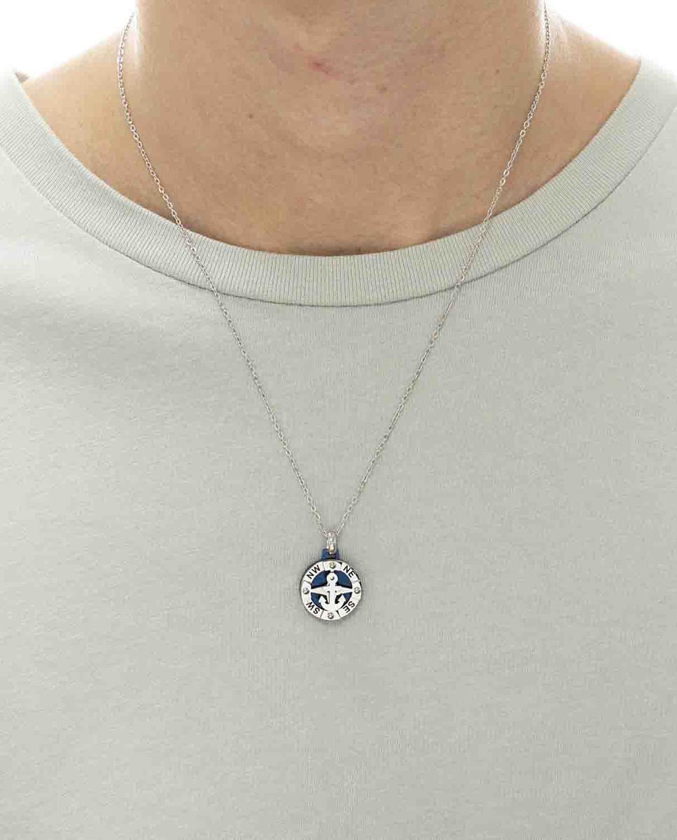 Colgante de acero inoxidable con chapa bicolor (IP azul y acero) de 18 mm de diámetro y detalle de ancla en acero con puntos cardinales esmaltados en negro. Cadena con cierre de mosquetón y largo a dos alturas (46 cms y 51 cms).