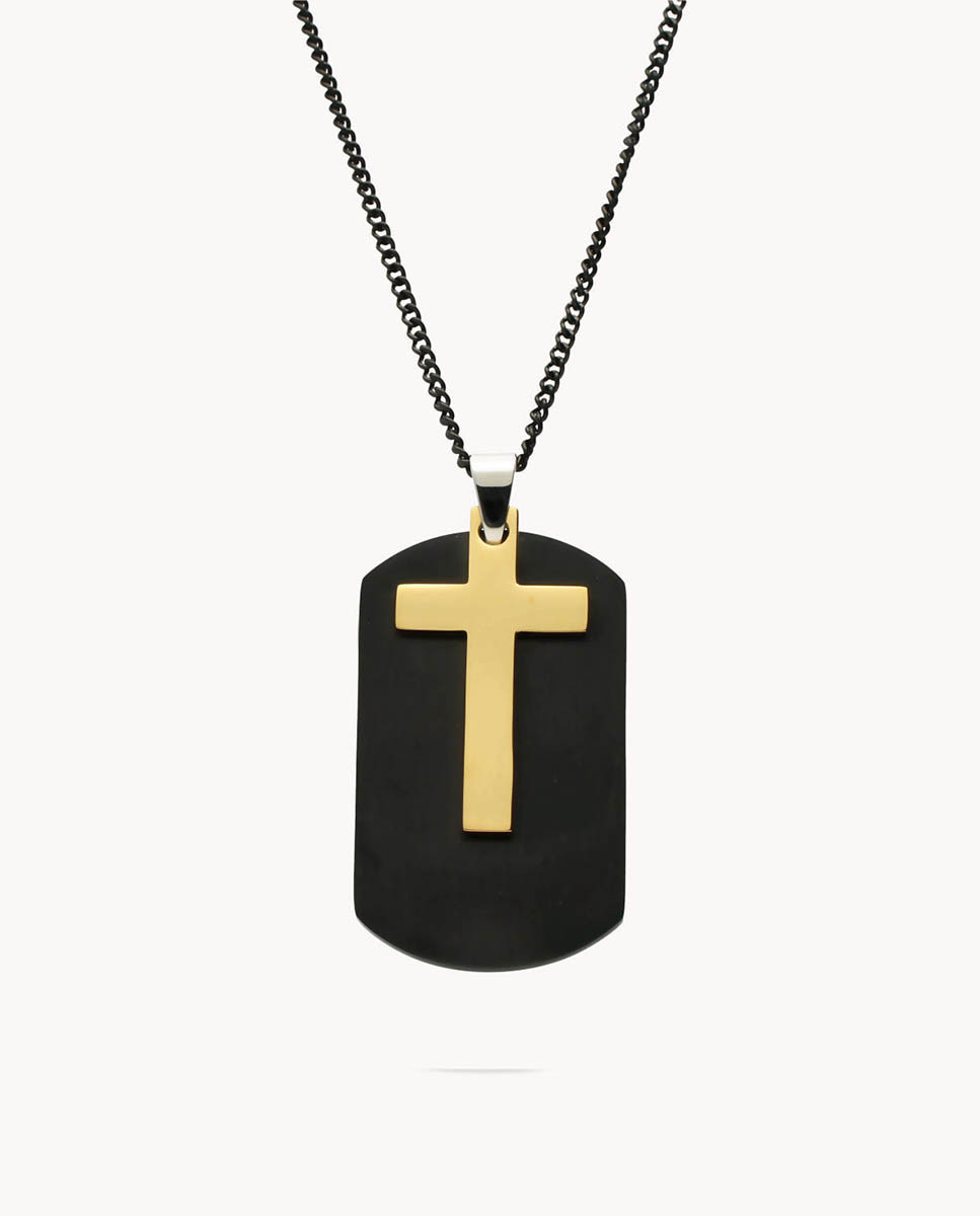 Colgante placa en acero inoxidable IP negro de 50 mm de largo por 30 mm de ancho con cruz IP dorado de 3,5 cms con movimiento libre y cadena de 50 cms.