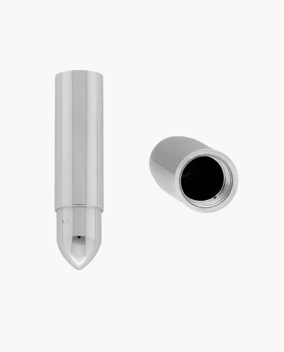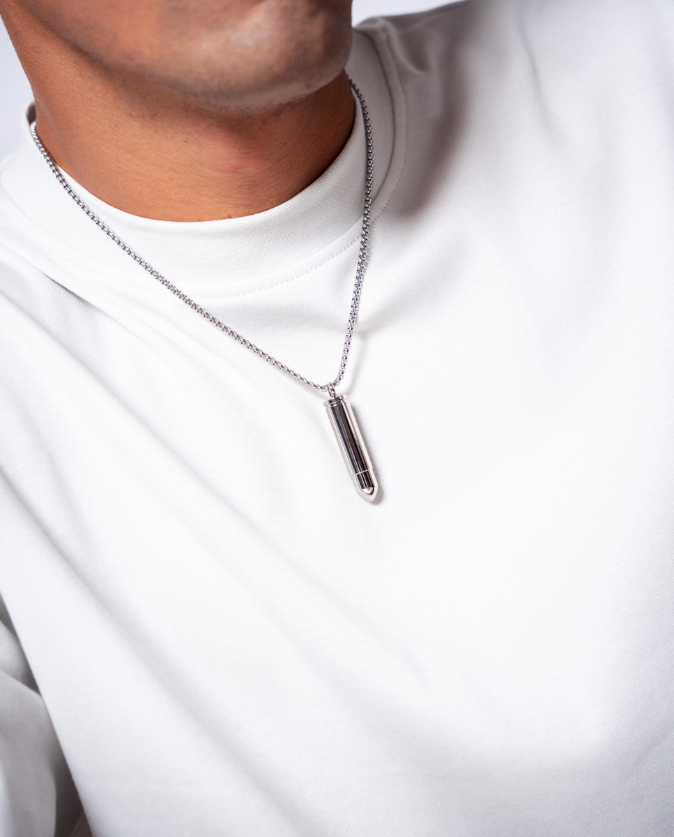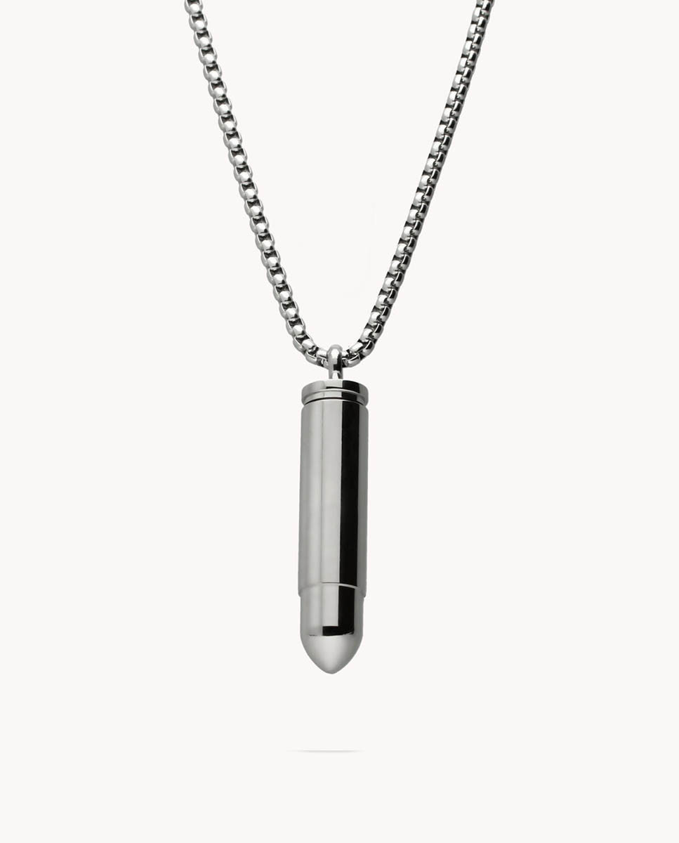 Colgante de acero inoxidable con motivo bala de 4 cms de largo con apertura en la parte superior. Cadena de 50 cms de largo y cierre de mosquetón.