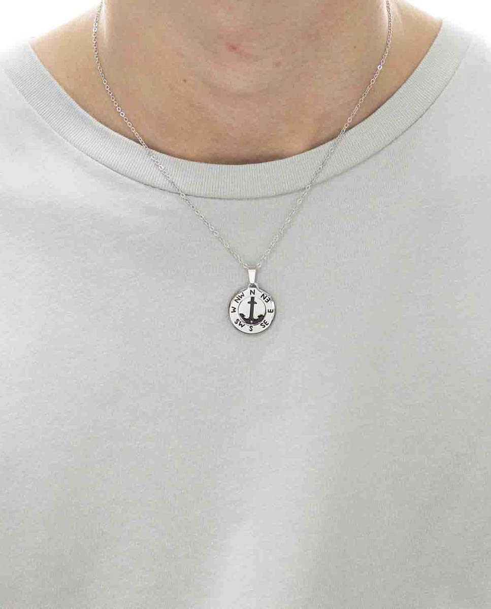 Colgante de acero inoxidable motivo brújula de 20 mm de diámetro y en su interior detalle de ancla en IP negro.