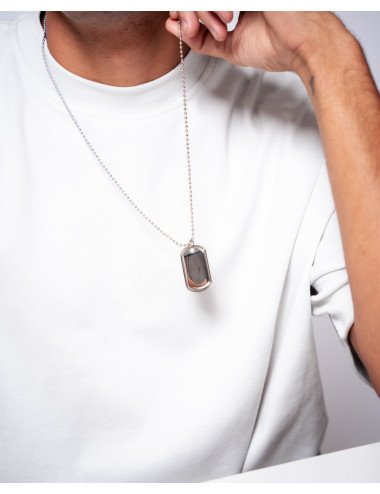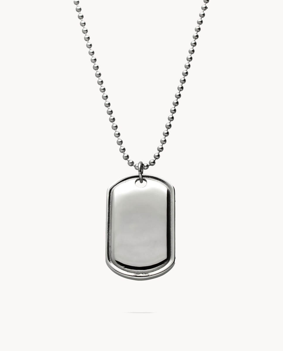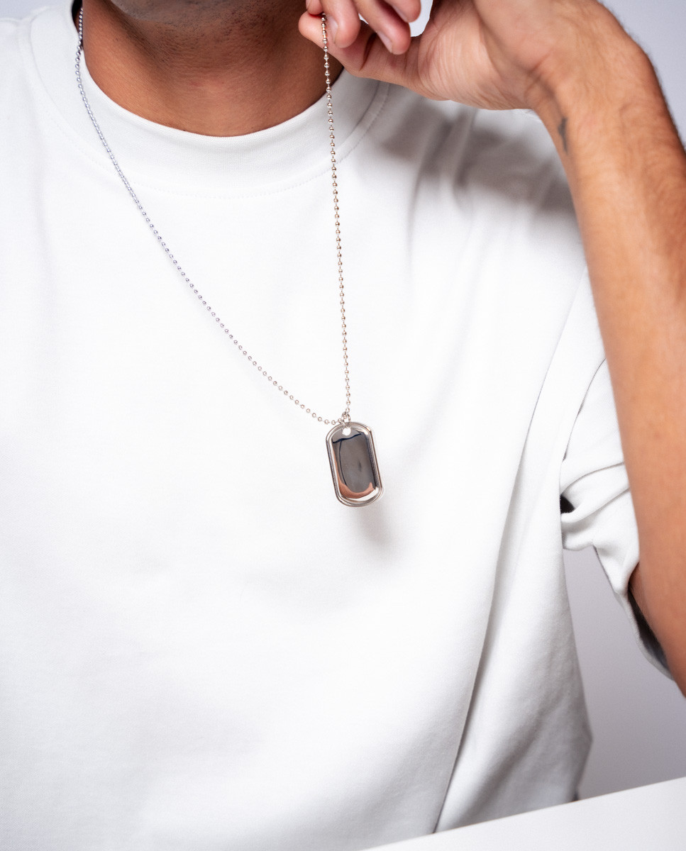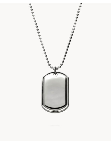 Colgante de acero inoxidable con chapa de 40 mm de alto y 24 mm de ancho. Cadena de 70 cms de largo.