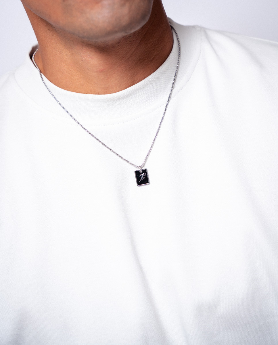 Colgante de acero inoxidable motivo atletismo con fondo esmaltado negro de 14 mm de largo por 6 mm de ancho. Cadena de 50 cms.