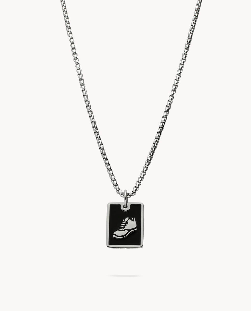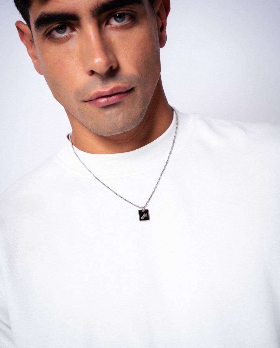Colgante de acero inoxidable motivo fútbol con fondo esmaltado negro de 14 mm de largo por 6 mm de ancho. Cadena de 50 cms. Cierre de mosquetón.