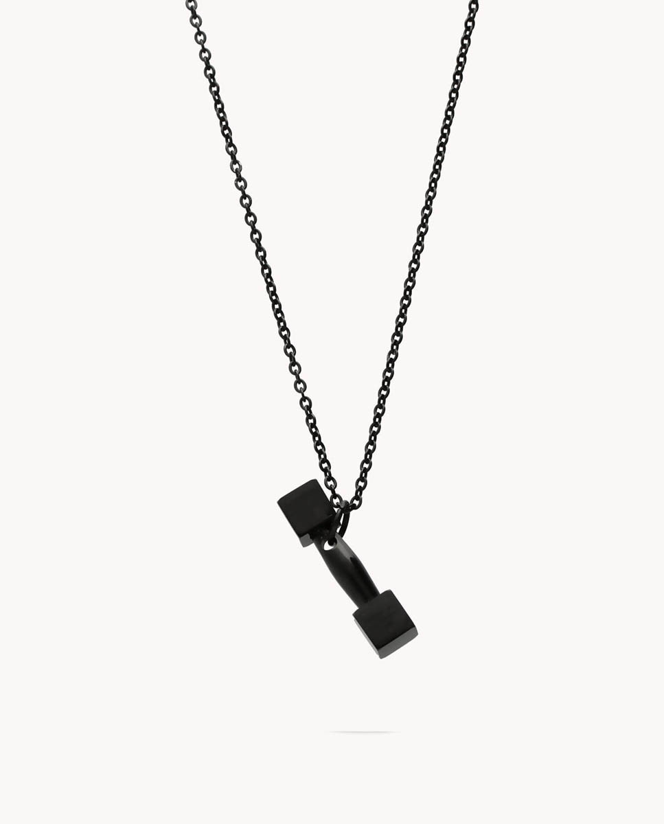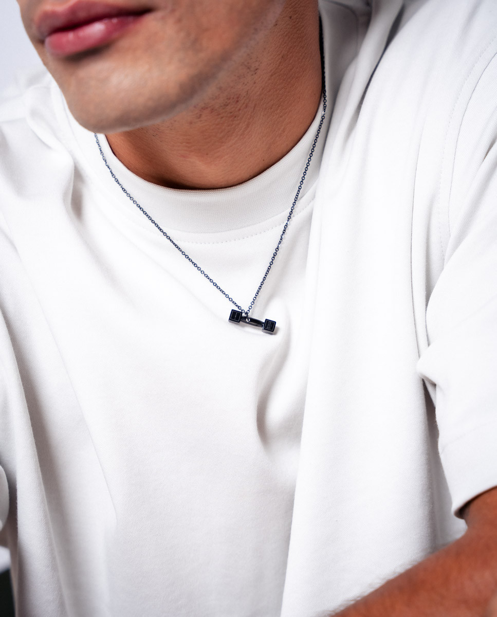 Colgante de acero inoxidable bañado en IP negro motivo pesa de 23 mm ancho. Cadena con dos posiciones 45-50 cms.
