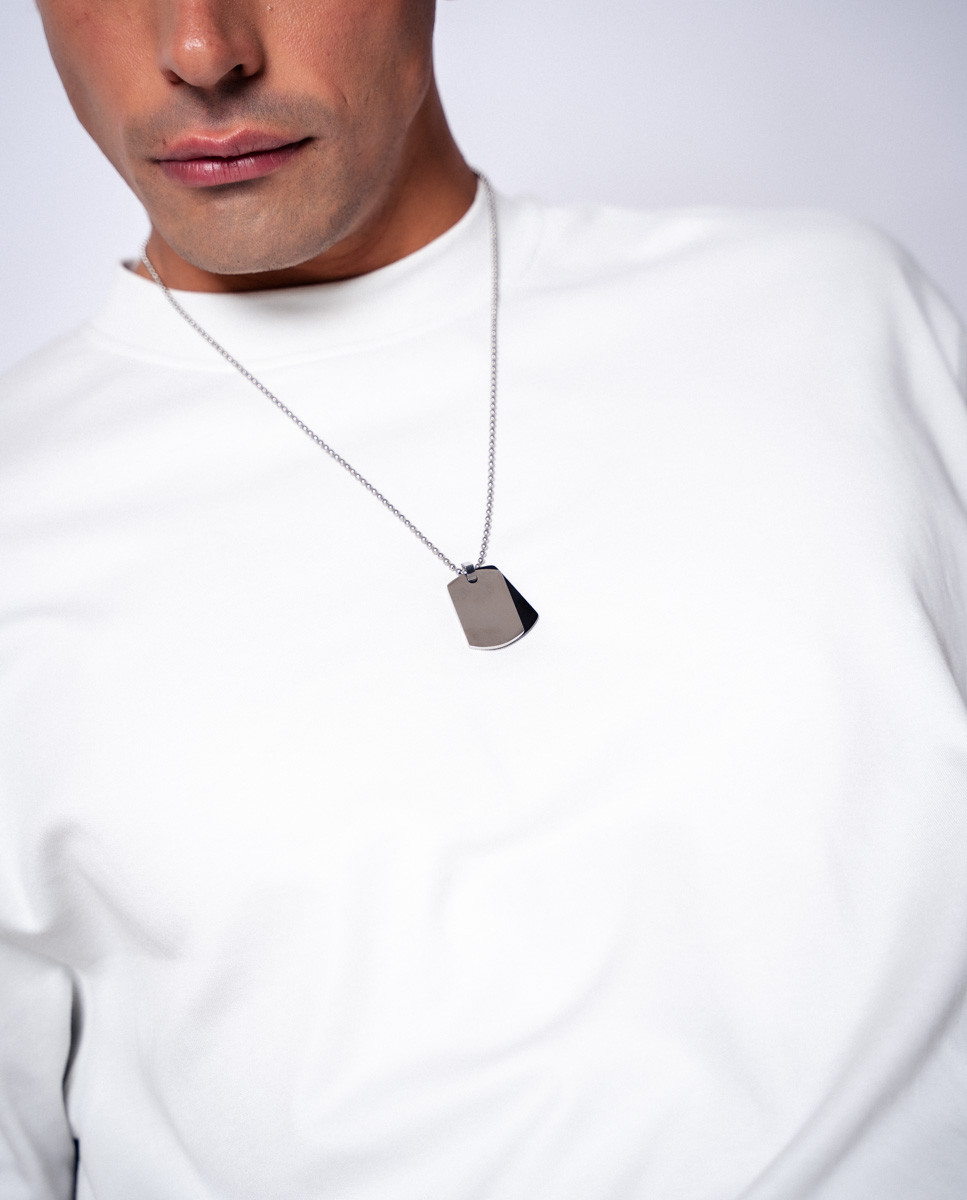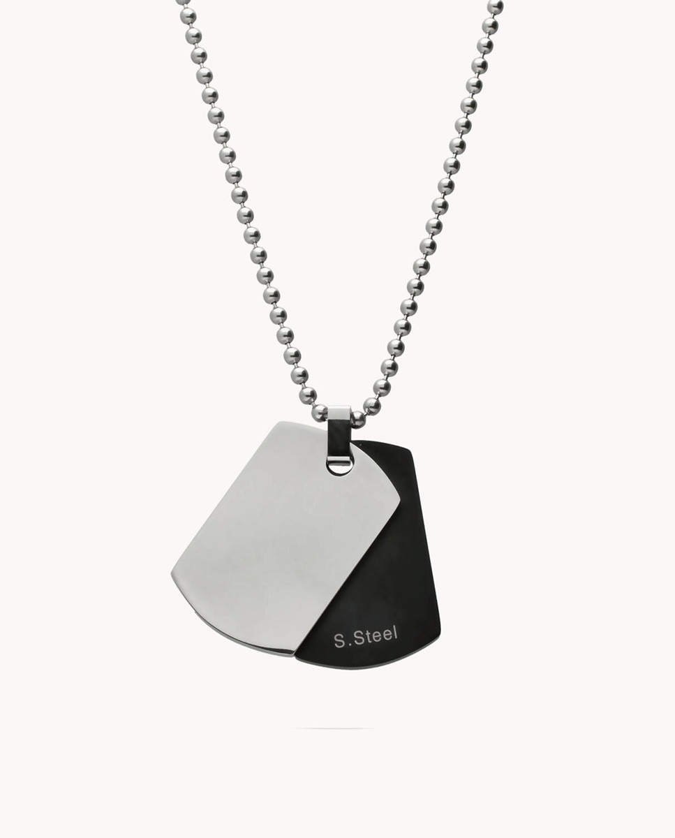 Colgante de acero inoxidable bicolor (IP negro y acero) con doble chapa de 30 mm de alto y 20 mm de ancho, cadena de 60 cms de largo.