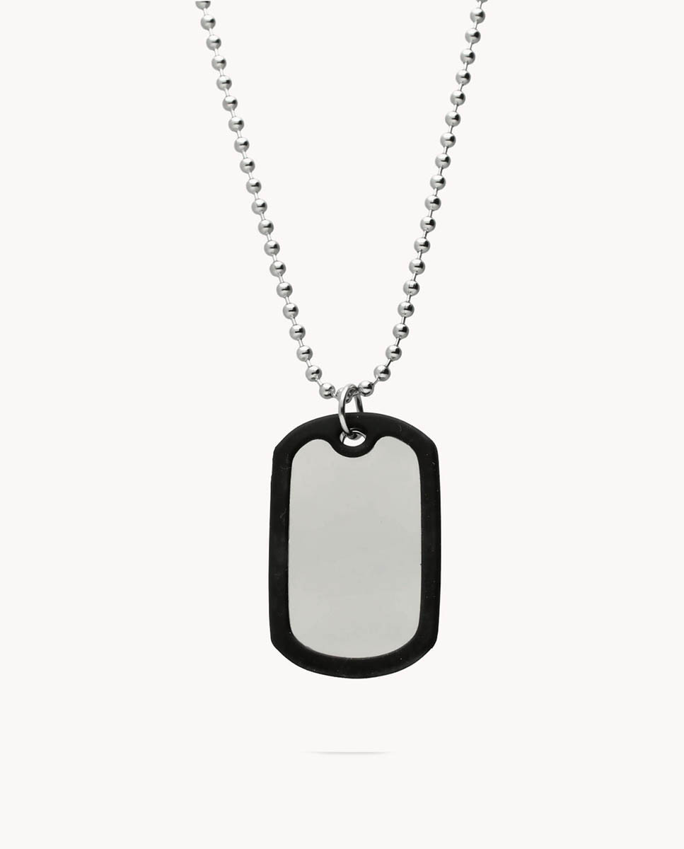 Colgante de acero inoxidable con chapa de 35 mm x 22 mm (alto por ancho) y marco de caucho, cadena de 65 cms de largo.