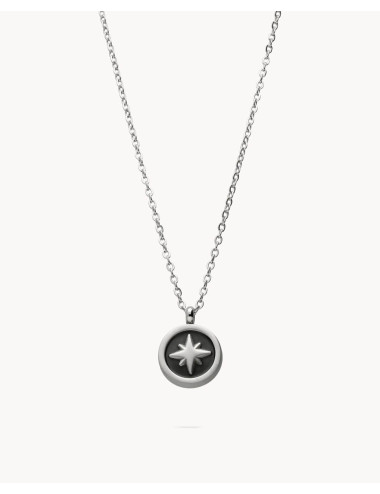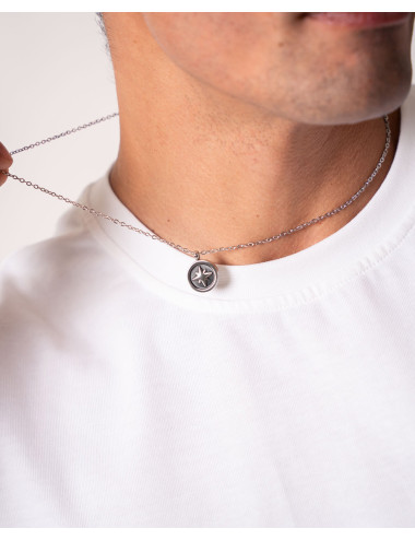 Colgante de acero inoxidable de 16 mm de diámetro y en su interior detalle de rosa de los vientos central con fondo IP negro. Largo a dos alturas (45 cms y 50,5 cms) y cierre de mosquetón.