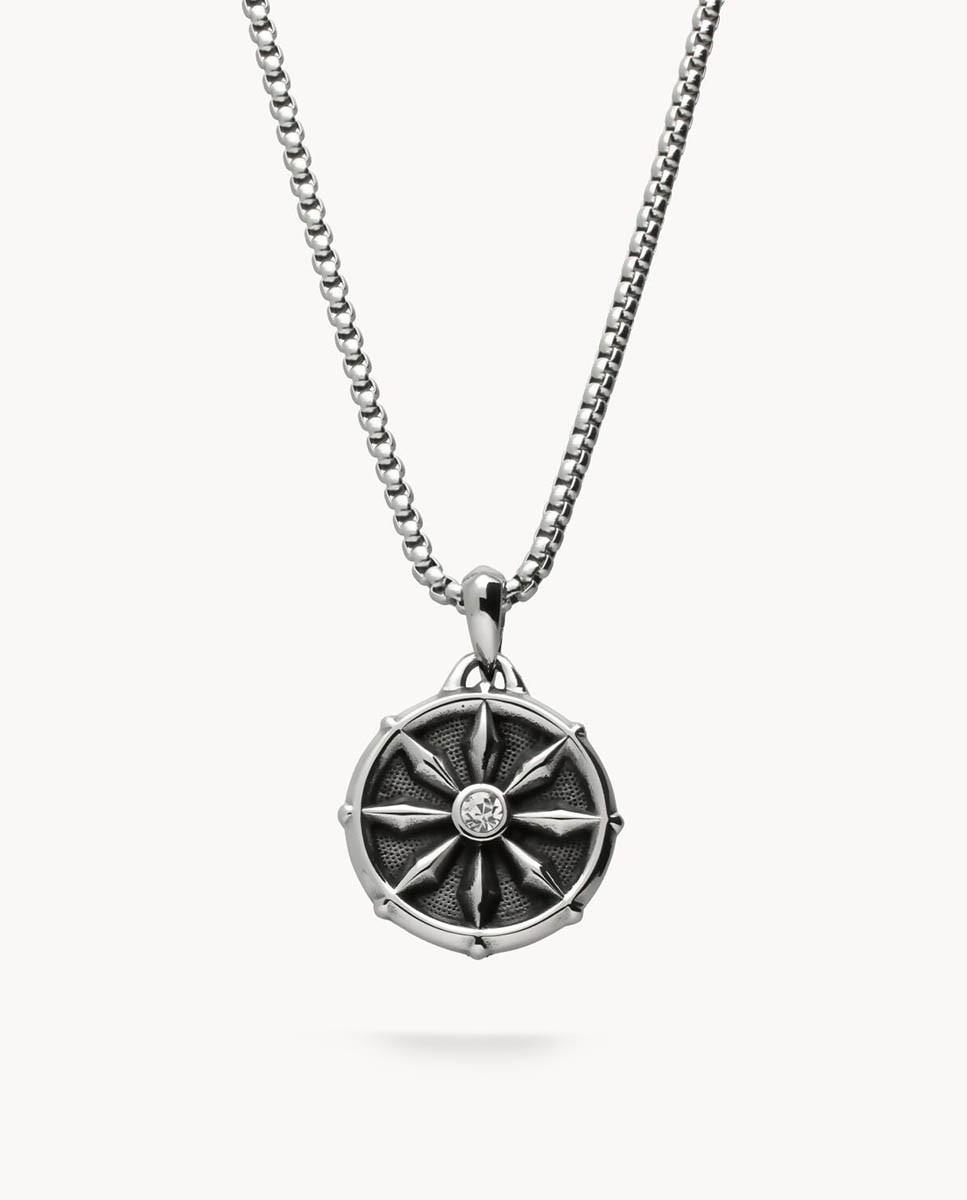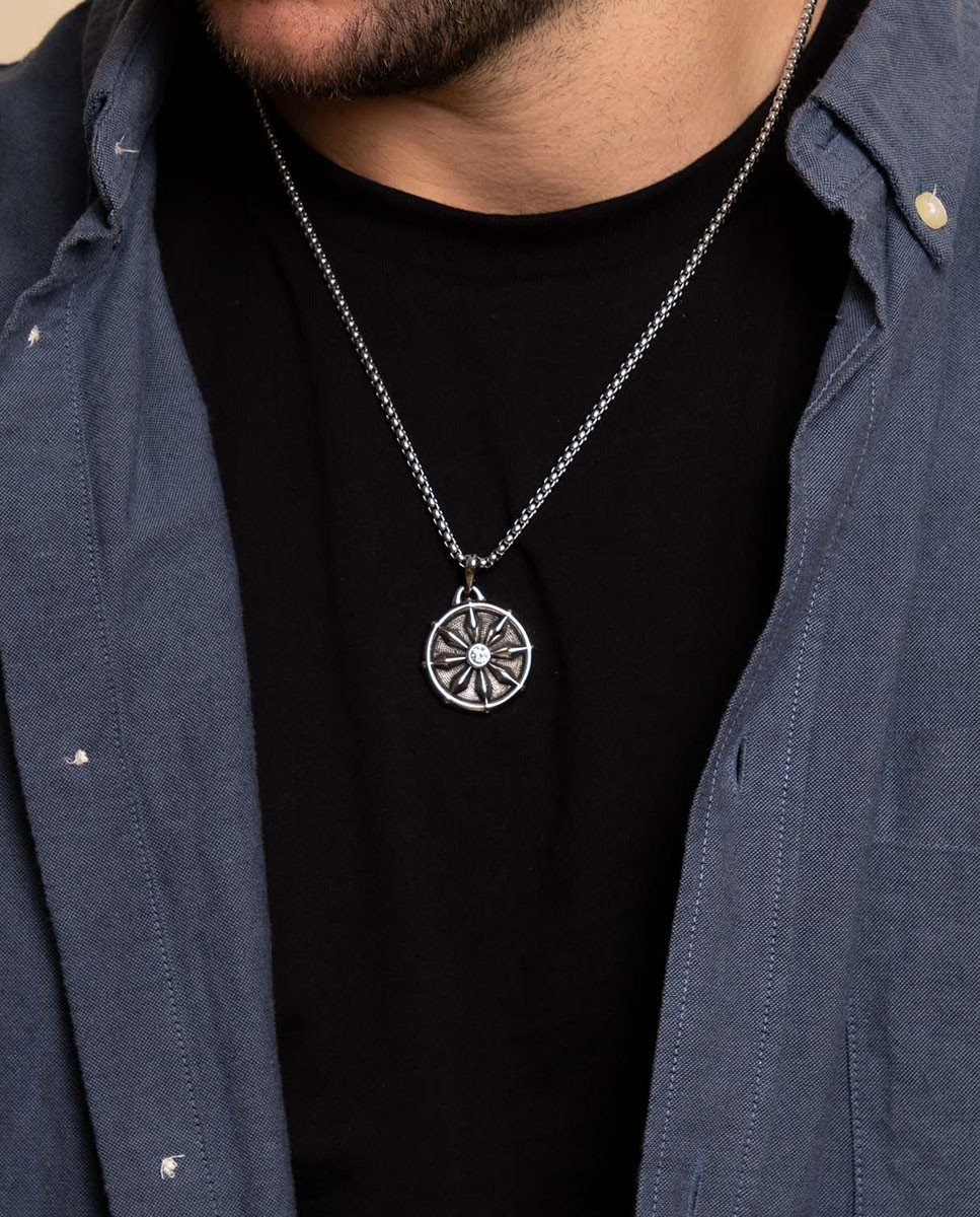 Colgante de acero inoxidable con sol de 27 mm de diámetro con circonita blanca central. Cadena con cierre de mosquetón y largo a dos alturas (50 cms y 55 cms).
