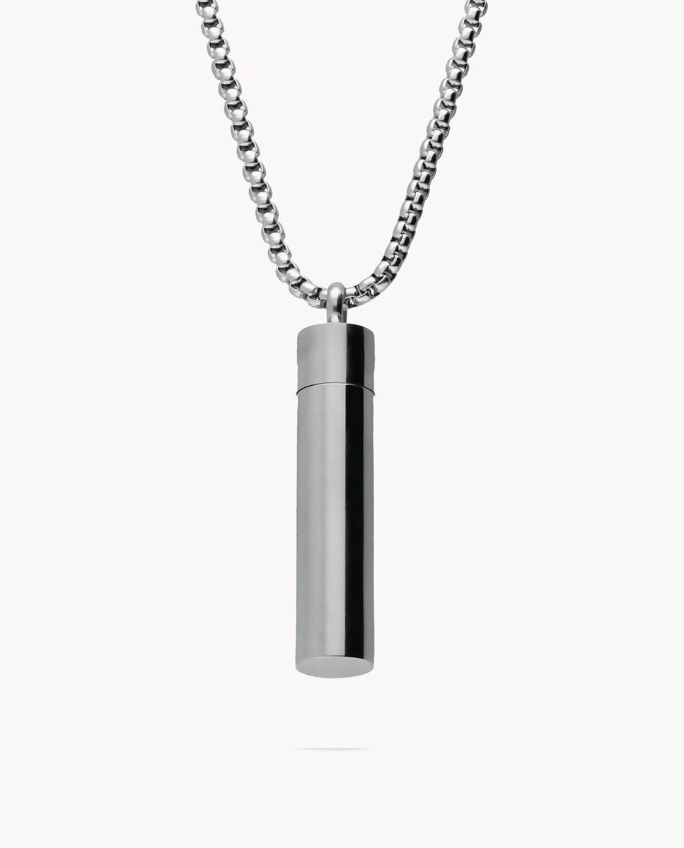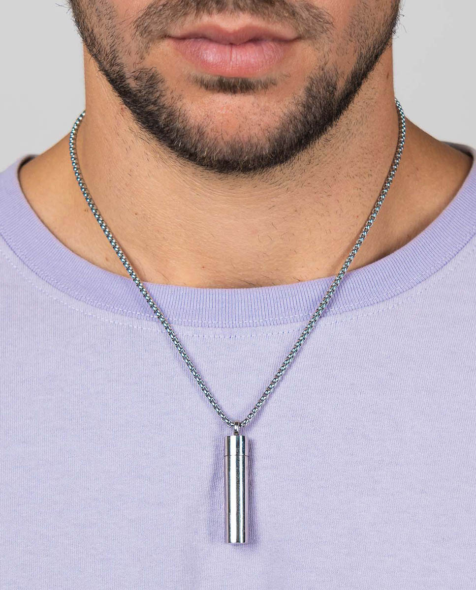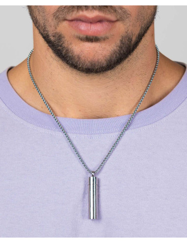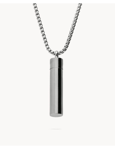 Colgante de acero inoxidable con cilindro de 4,2 cms de largo con apertura de rosca en la parte superior. Cadena de 50 cms de largo y cierre de mosquetón.