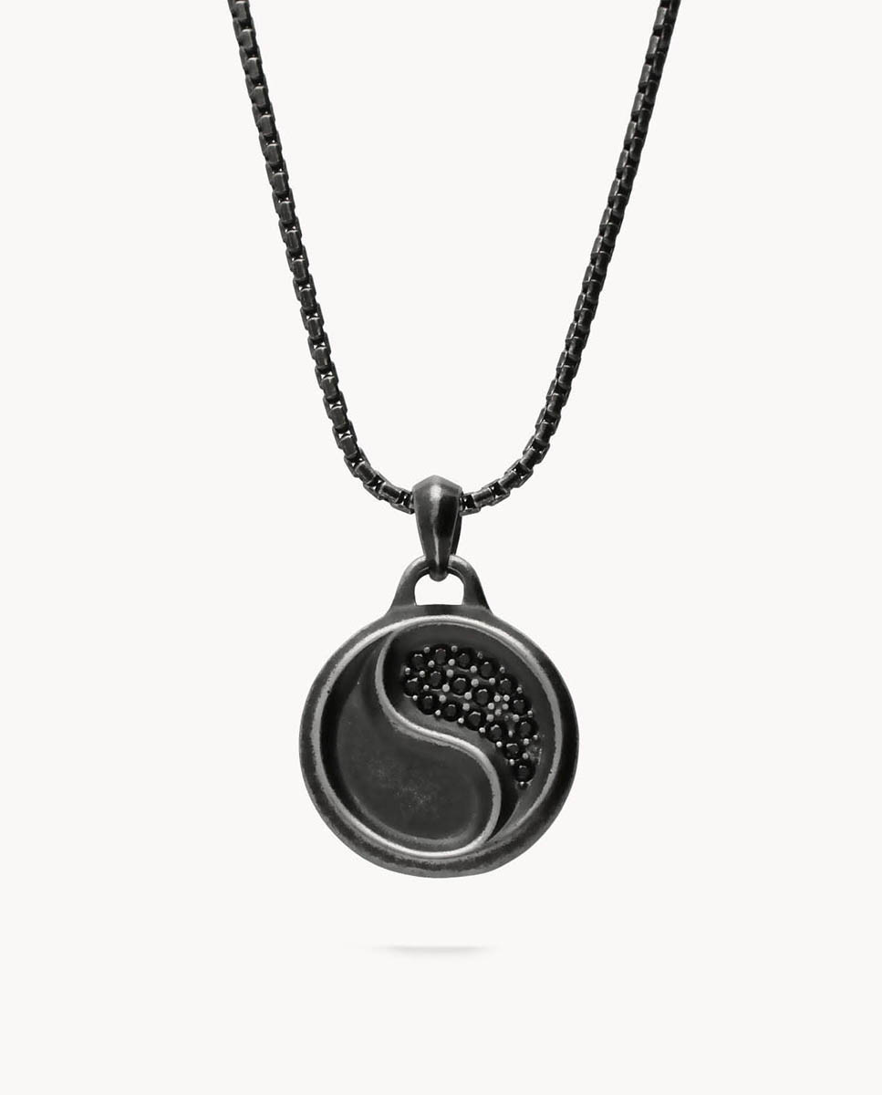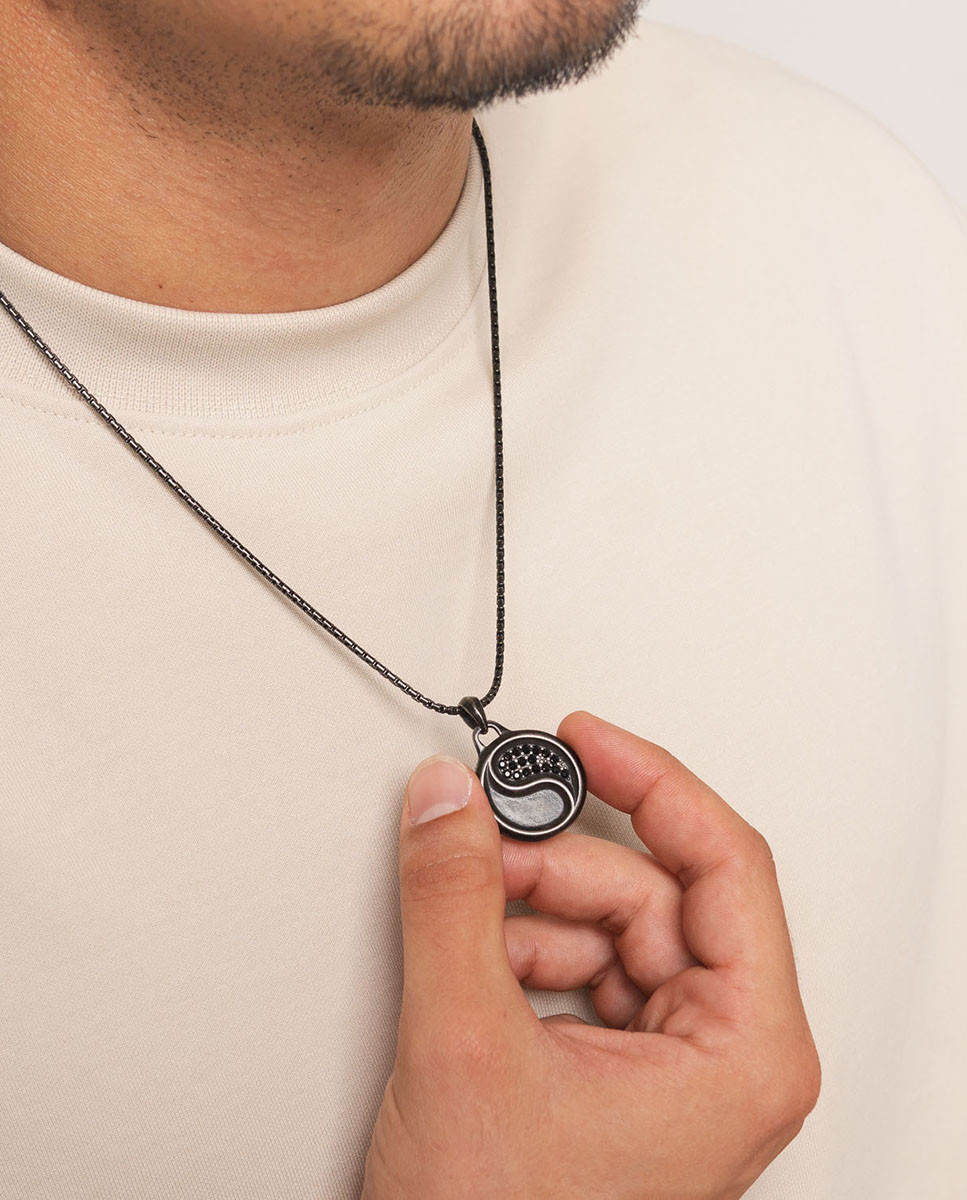 Colgante de acero inoxidable envejecido con Ying-Yang de 24 mm de diámetro y circonitas negras. Cadena en IP negro con cierre de mosquetón y largo de 50 cms más 5 cms de alargador.