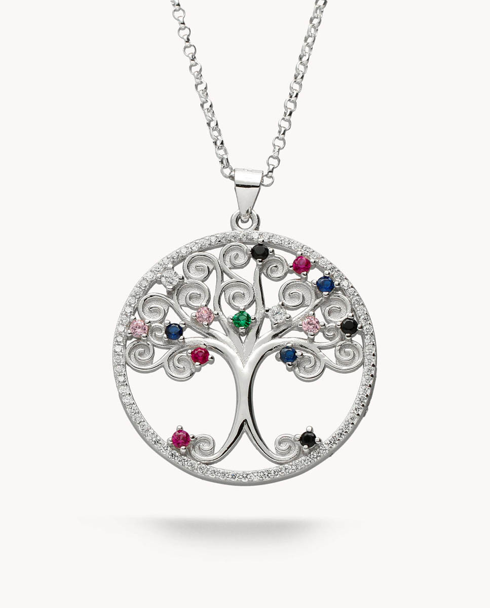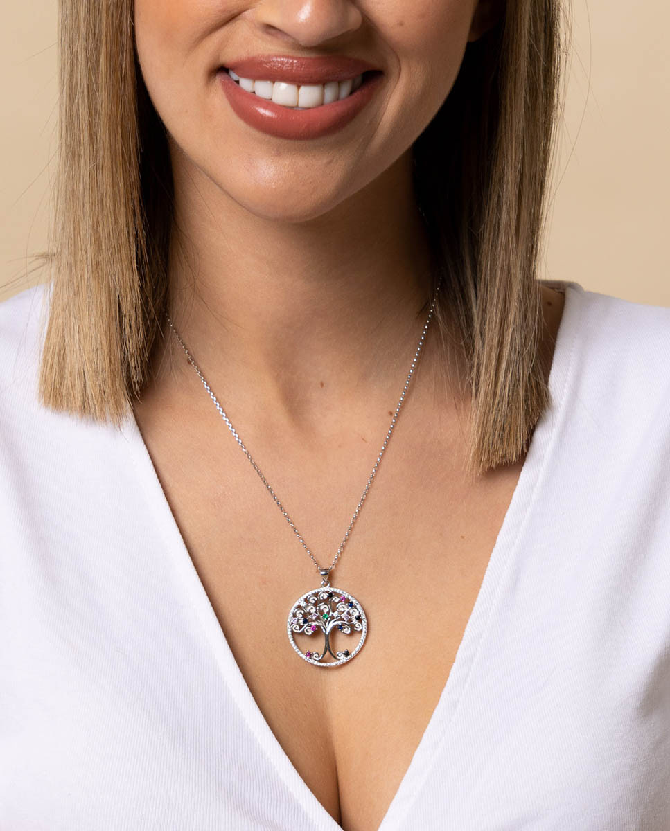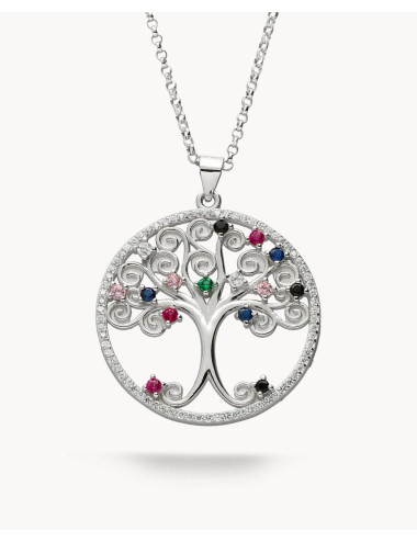Colgante de plata de ley 925 bañada en rodio con árbol de la vida de 29 mm de diámetro y circonitas multicolor. Cadena de 45 cms de largo con cierre tipo reasa.