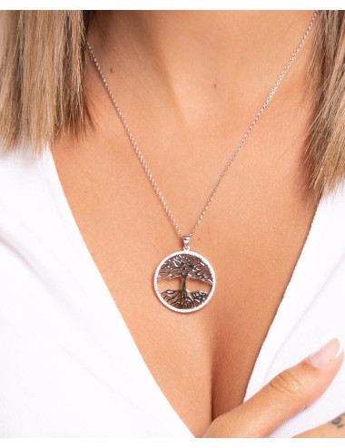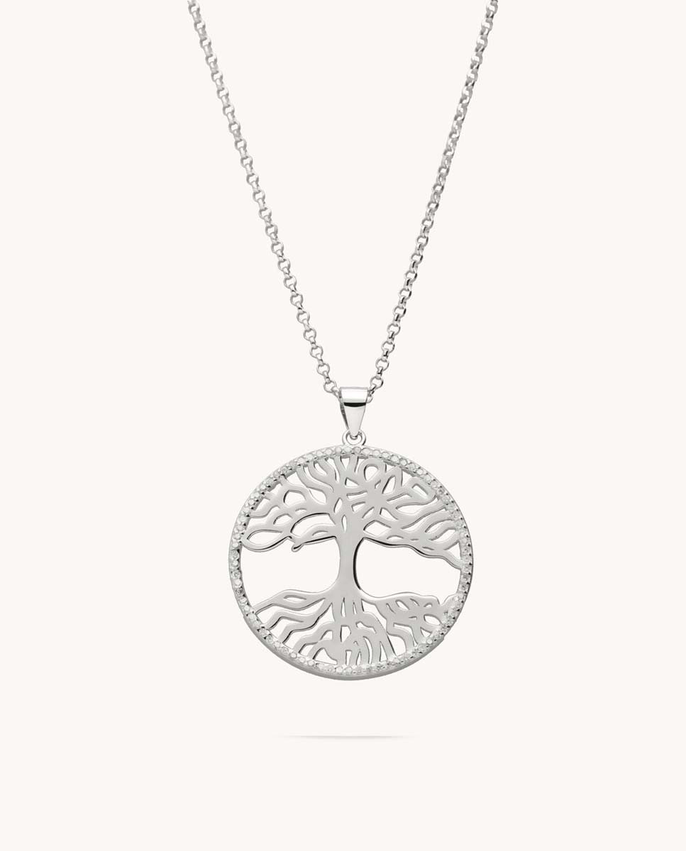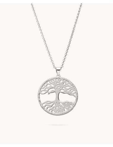 Colgante de plata de ley 925 bañada en rodio con árbol de la vida de 28 mm de diámetro y circonitas blancas. Cadena de 45 cms de largo con cierre tipo reasa.