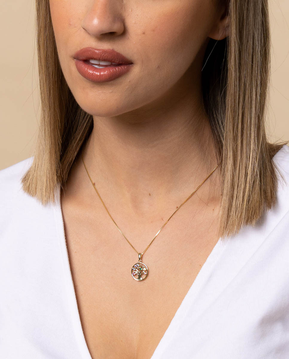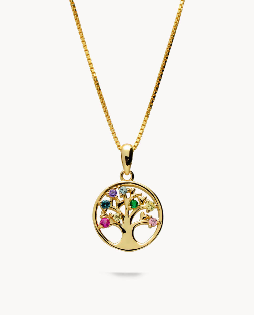Colgante de plata de ley 925 bañada en oro 18K con árbol de la vida de 15 mm de diámetro. Cadena de 40 cms de largo más 5 cms de alargador y cierre tipo reasa.