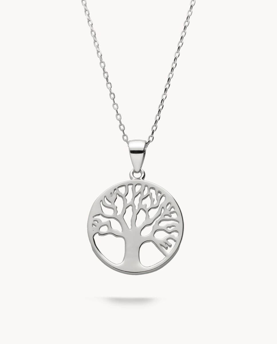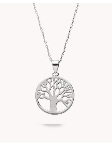 Colgante de plata de ley 925 bañada en rodio con árbol de la vida de 18 mm de diámetro. Cadena de 39 cms de largo más 4,5 cms de alargador y cierre tipo reasa.