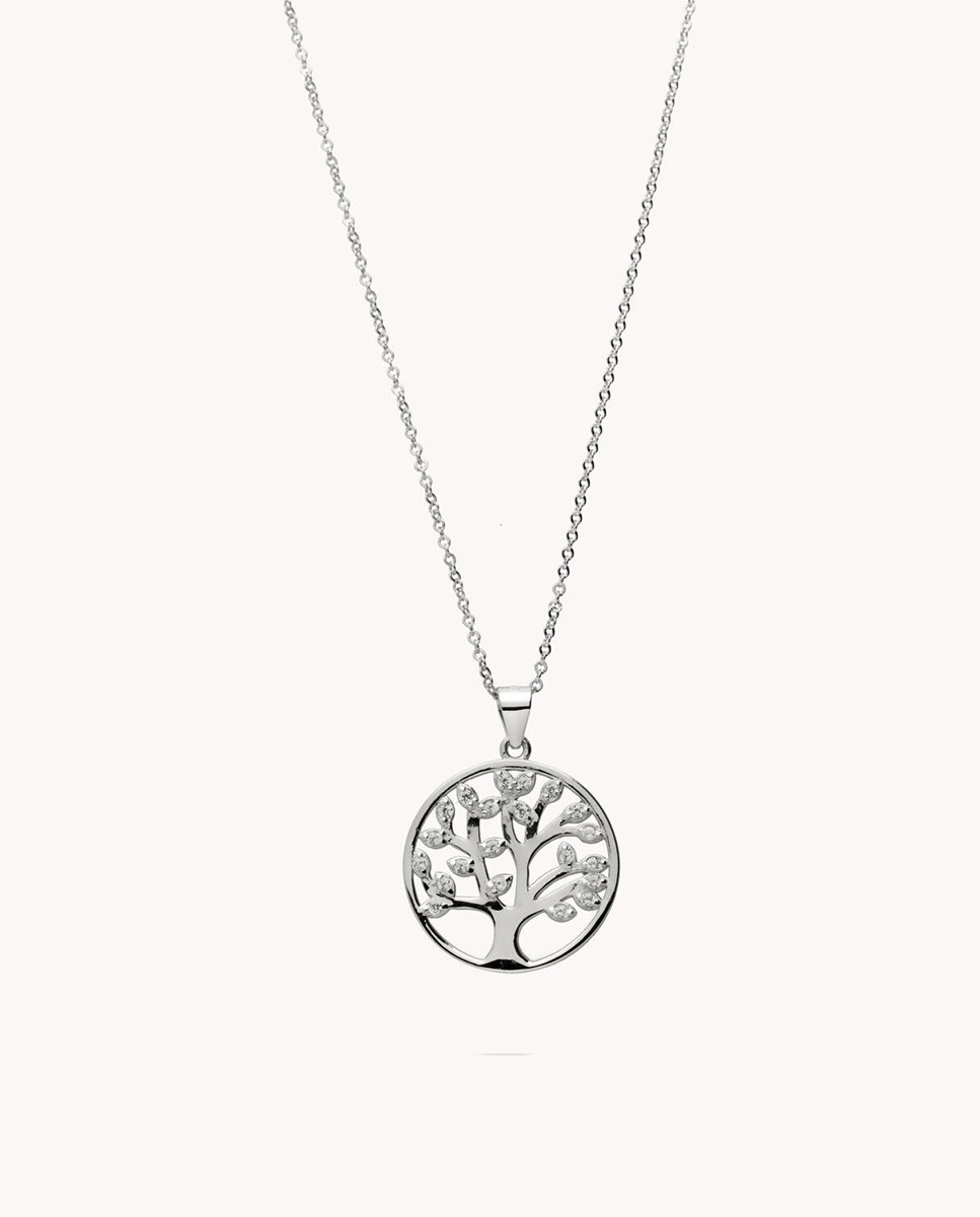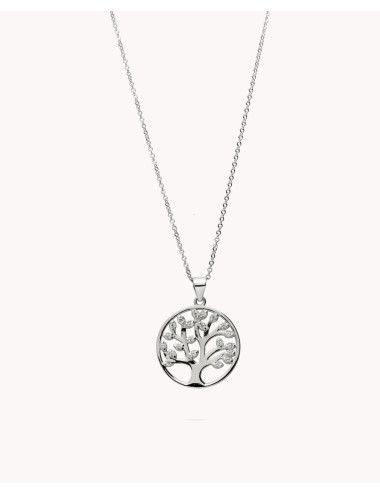 Colgante de plata de ley 925 bañada en rodio con árbol de la vida y circonitas blancas de 20 mm de diámetro. Cadena de 45 cms de largo con cierre tipo reasa.