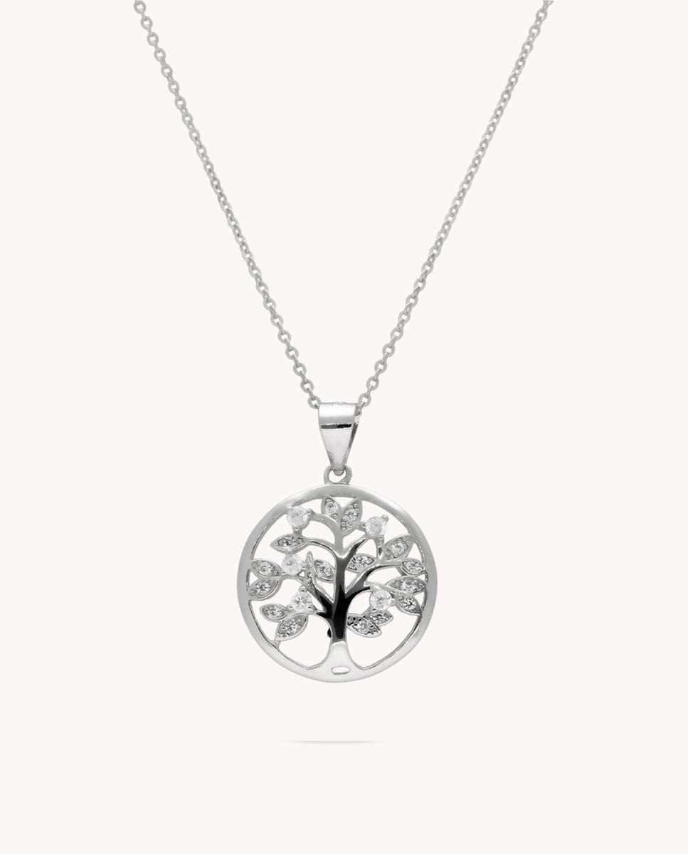 Colgante de plata de ley 925 bañada en rodio con árbol de la vida de 16 mm de diámetro y circonitas blancas. Cadena de 45 cms de largo y cierre tipo reasa.
