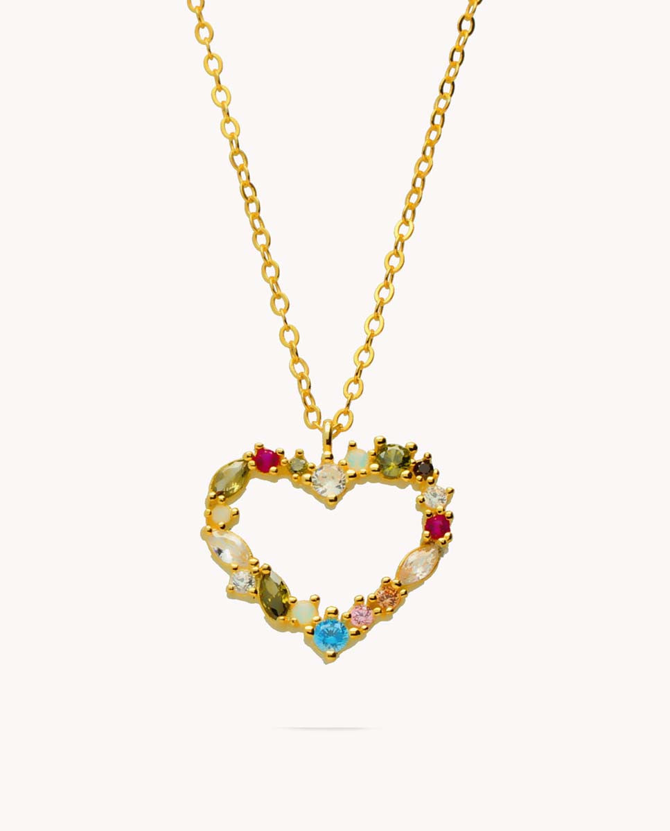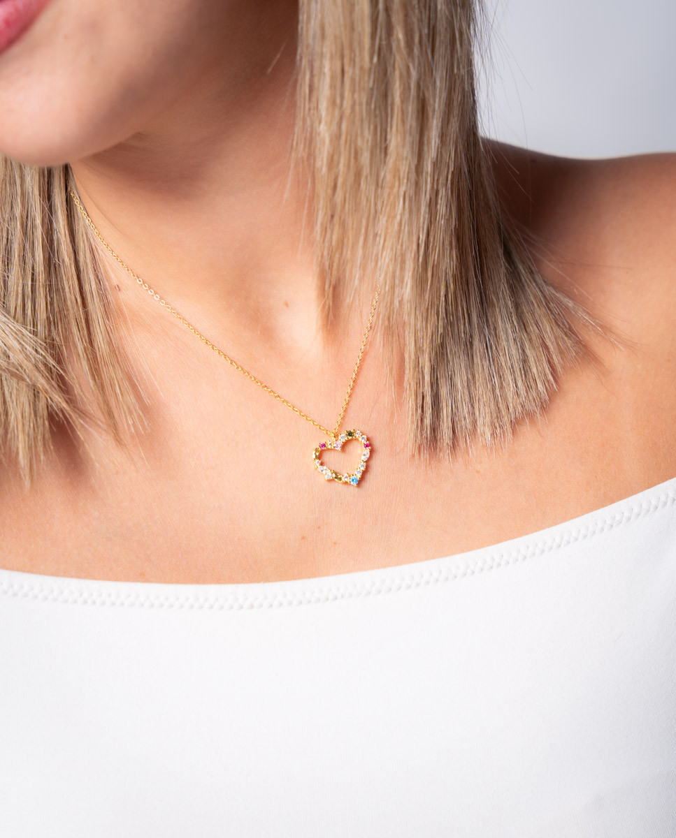 Colgante de plata de ley 925 bañada en oro 18K con corazón de 18 mm x 16 mm (ancho por alto) y circonitas multicolor, cadena de 40 cms más 5,5 cms de alargador y cierre de mosquetón.