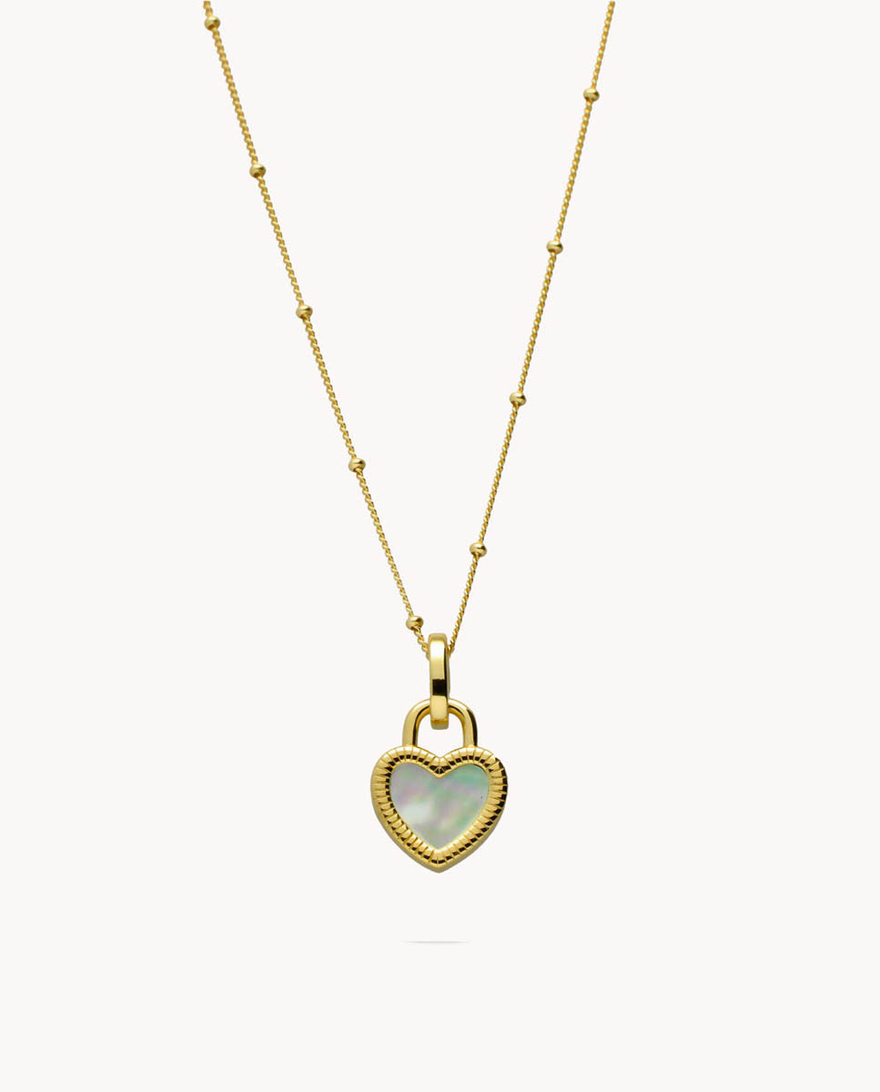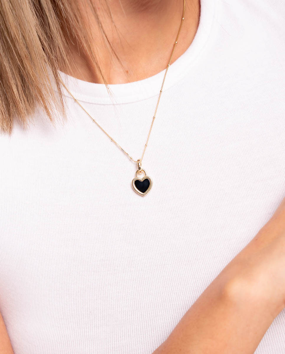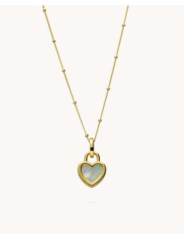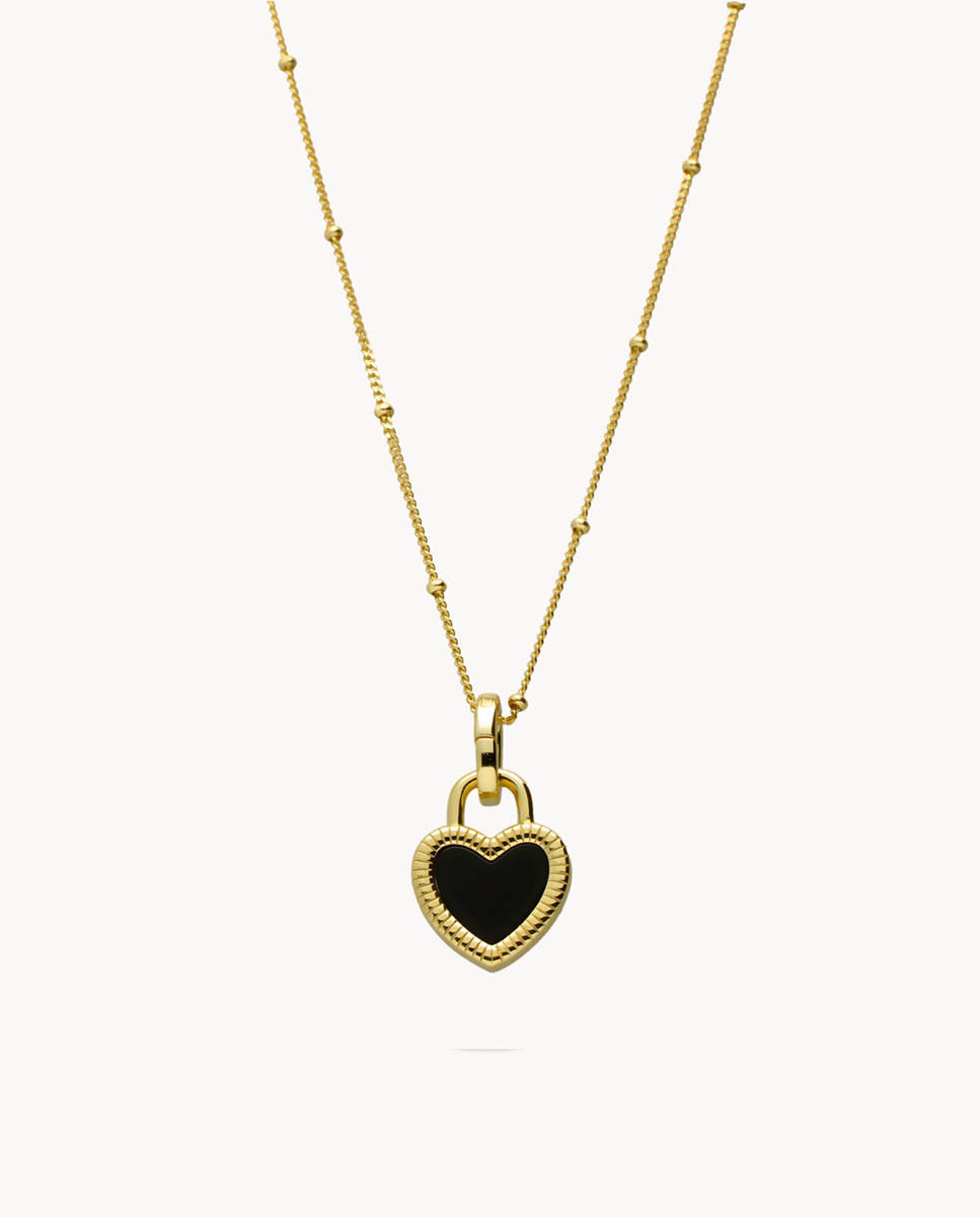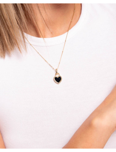 Colgante de plata de ley 925 bañada en oro 18K con cadena de eslabón tipo barbado de 1 mm de grosor y bolas intercaladas de 2 mm de diámetro con corazón de 14 mm x 14 mm (ancho por alto) y 3 mm de grosor, piedra natural Onix por un lado y nácar por el otro lado, largo de 40 cms más 5 cms de alargador y cierre de mosquetón.