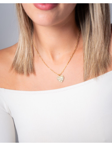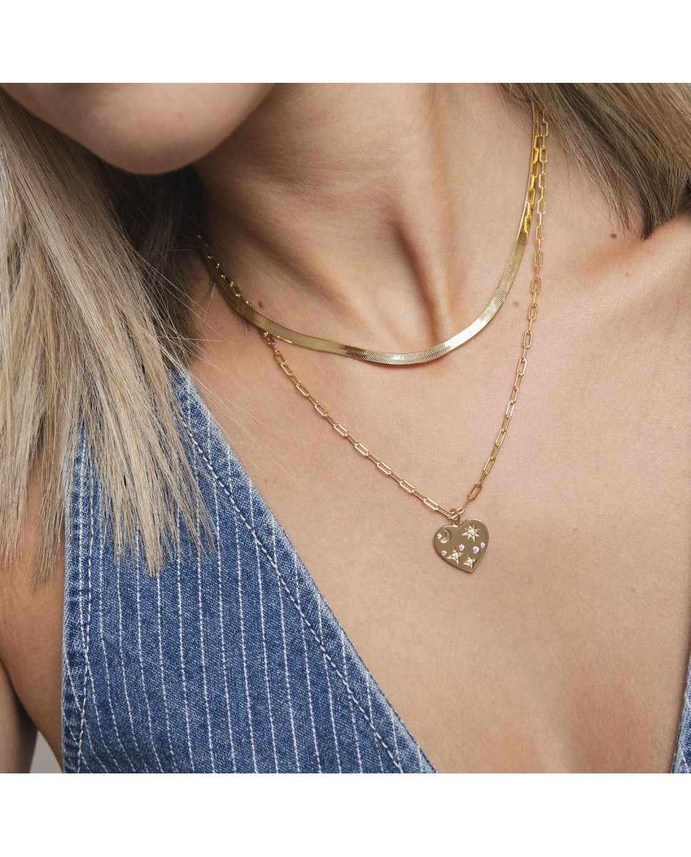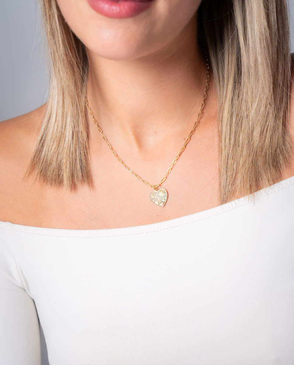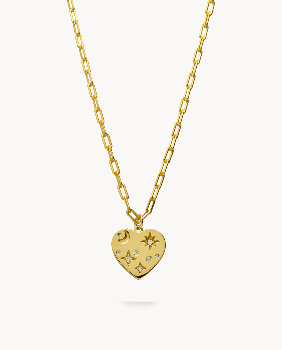 Colgante de plata de ley 925 bañada en oro de 18K con corazón central de 16 mm x 15 mm (ancho por alto) con estrellas, lunas y circonitas blancas en su interior, largo de 40 cms más 5 cms de alargador y cierre de mosquetón.