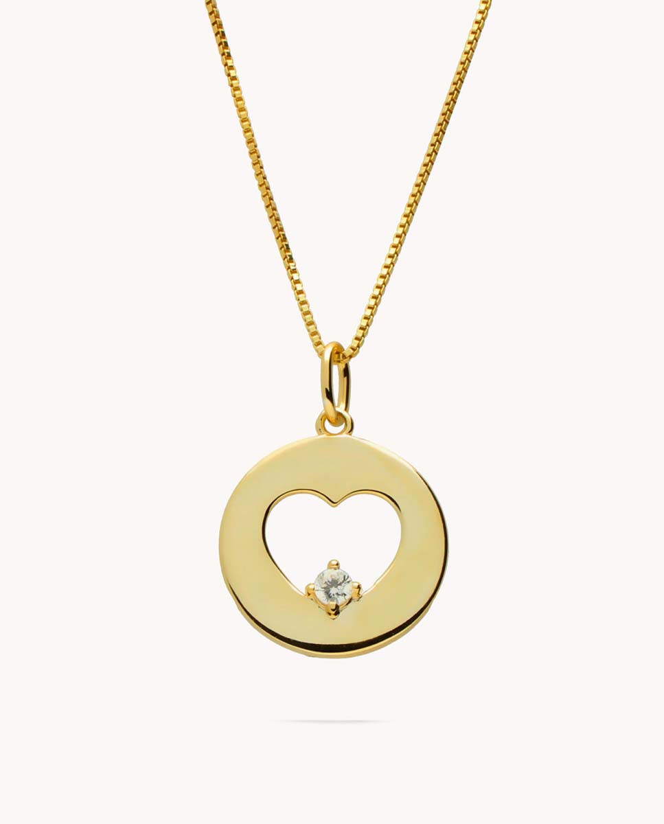 Colgante de plata de ley 925 bañada en oro con círculo, silueta interior de corazón y una circonita blanca central. Cadena de 40 cms más 5 cms de alargador y cierre tipo reasa.