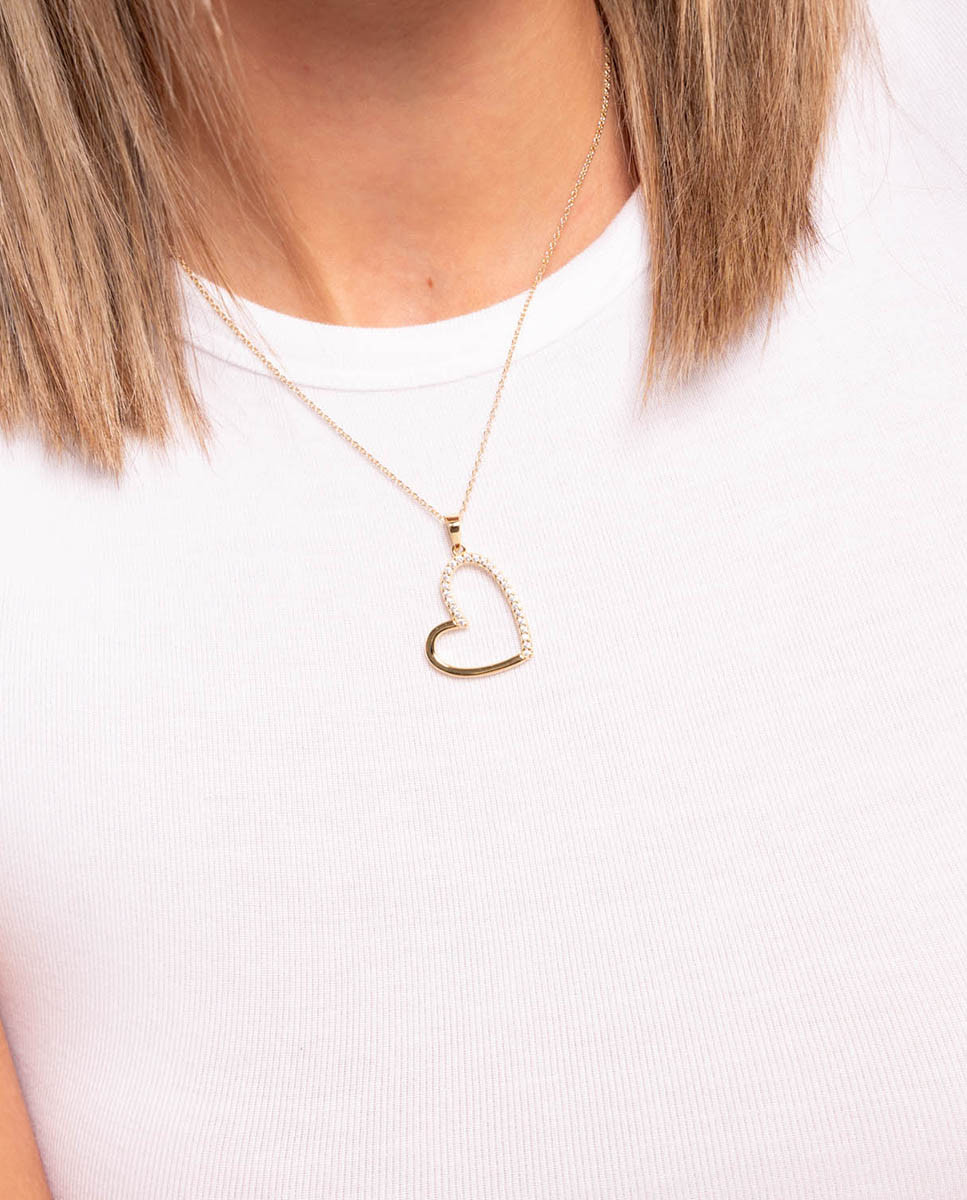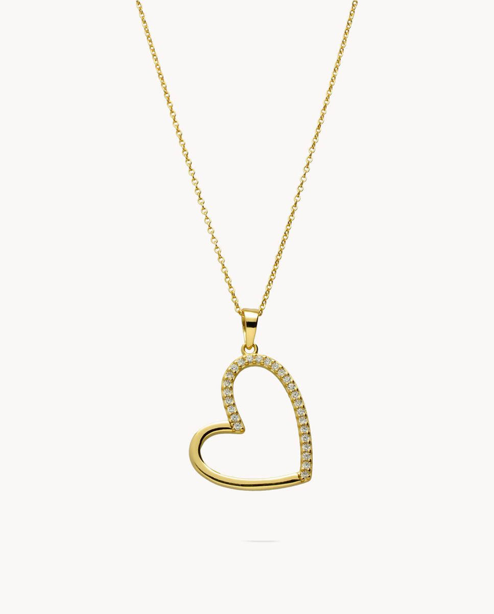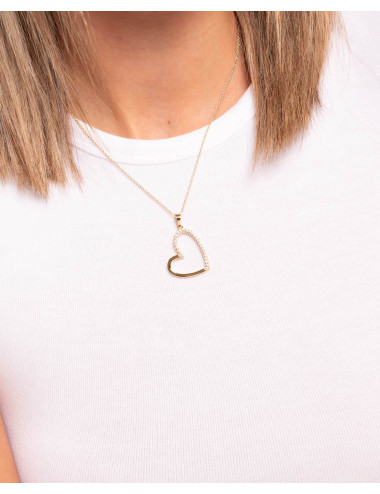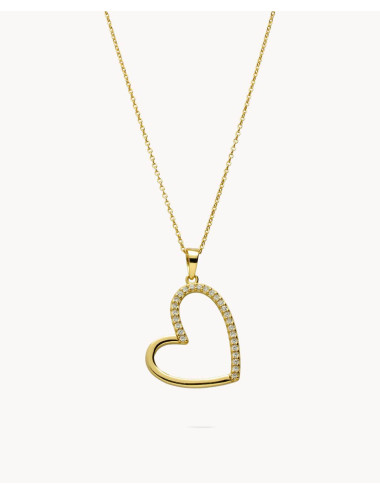 Colgante de plata de ley 925 bañada en oro 18K con silueta de corazón de 23 mm x 27 mm (ancho por alto) y circonitas blancas, cadena de 40 cms más 5 cms de alargador y cierre de mosquetón.
