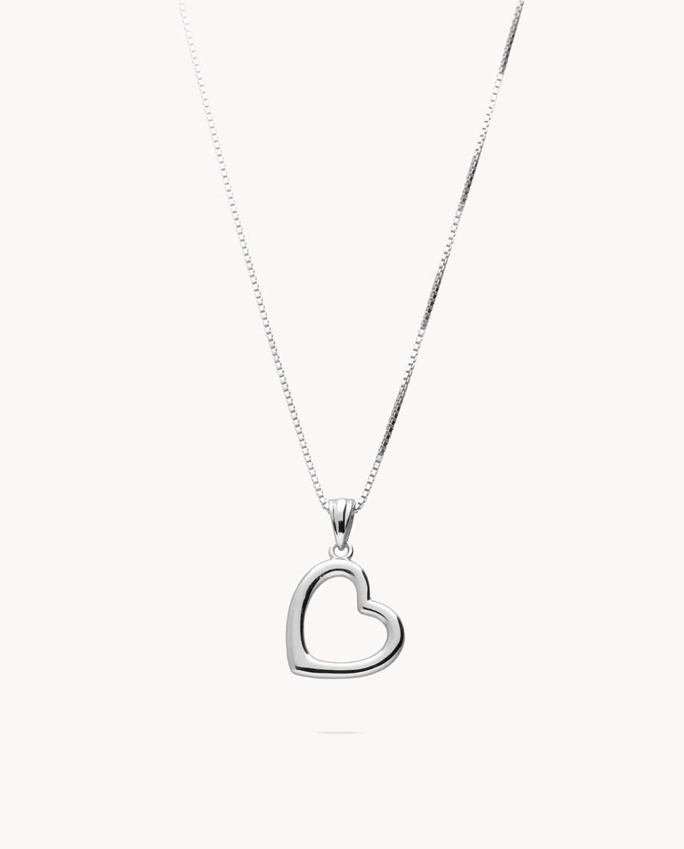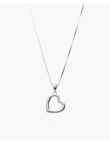 Colgante de plata de ley 925 bañada en rodio con silueta de corazón de 15 mm x 15 mm (ancho por alto), cadena de 40 cms de largo más 5 cms de alargador y cierre tipo reasa.