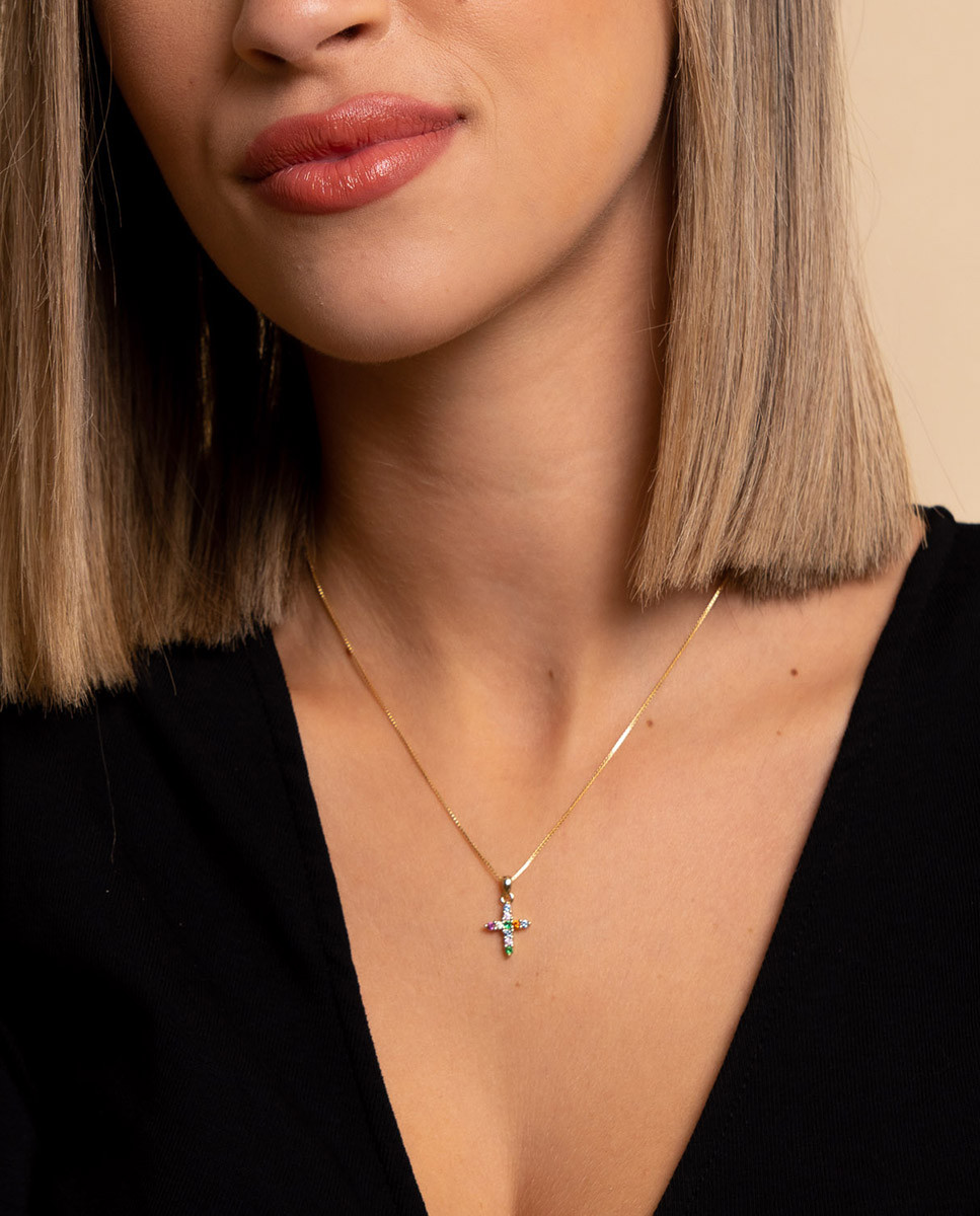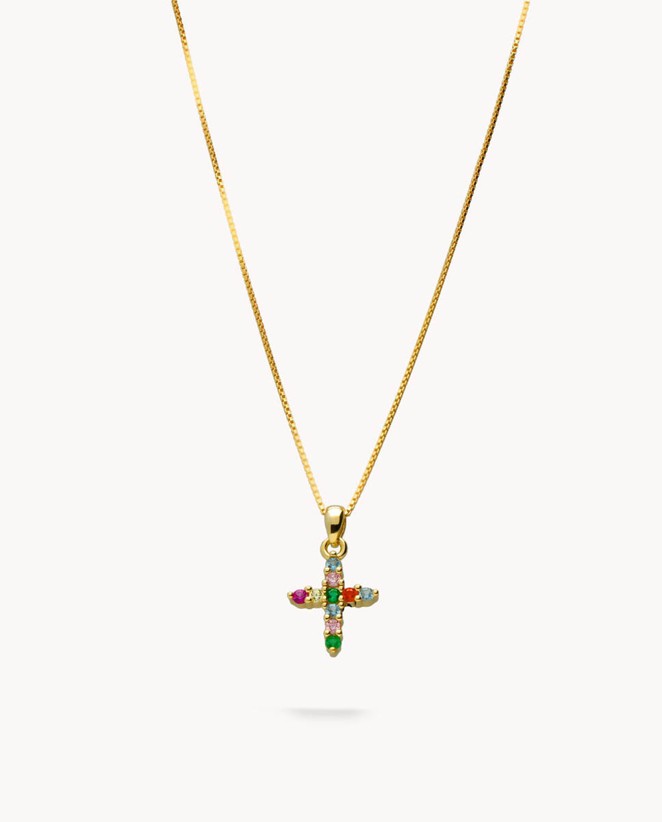 Colgante de plata de ley 925 bañada en oro 18K con cruz de 10 mm x 12 mm (ancho por alto) y circonitas multicolor en su interior. Cadena de 40 cms más 5 cms de alargador y cierre tipo reasa.