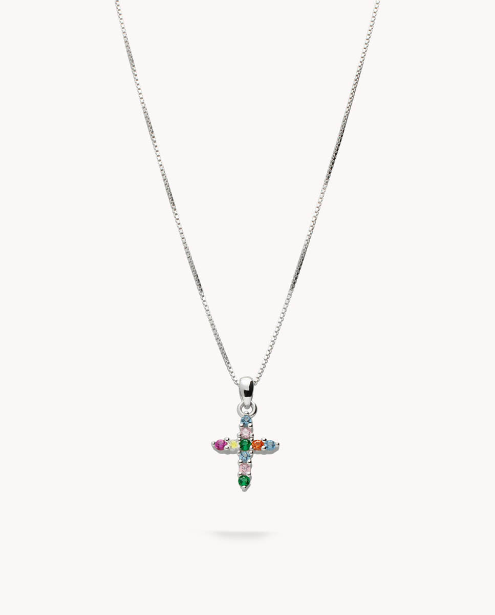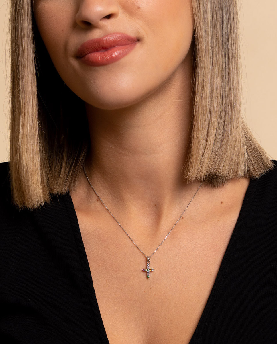 Colgante de plata de ley 925 bañada en rodio con cruz de 10 mm x 12 mm (ancho por alto) y circonitas multicolor en su interior. Cadena de 40 cms más 5 cms de alargador y cierre tipo reasa.