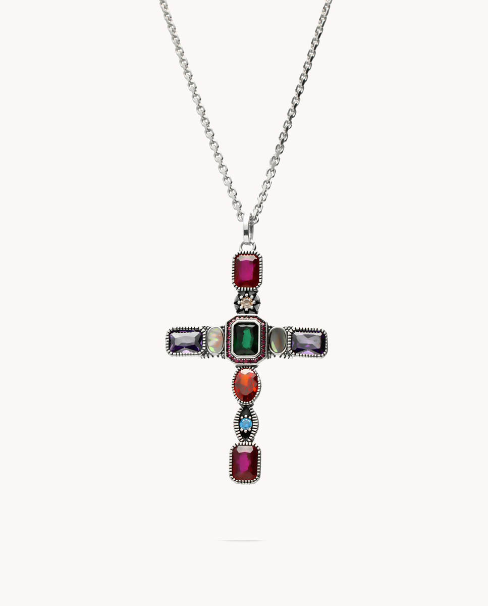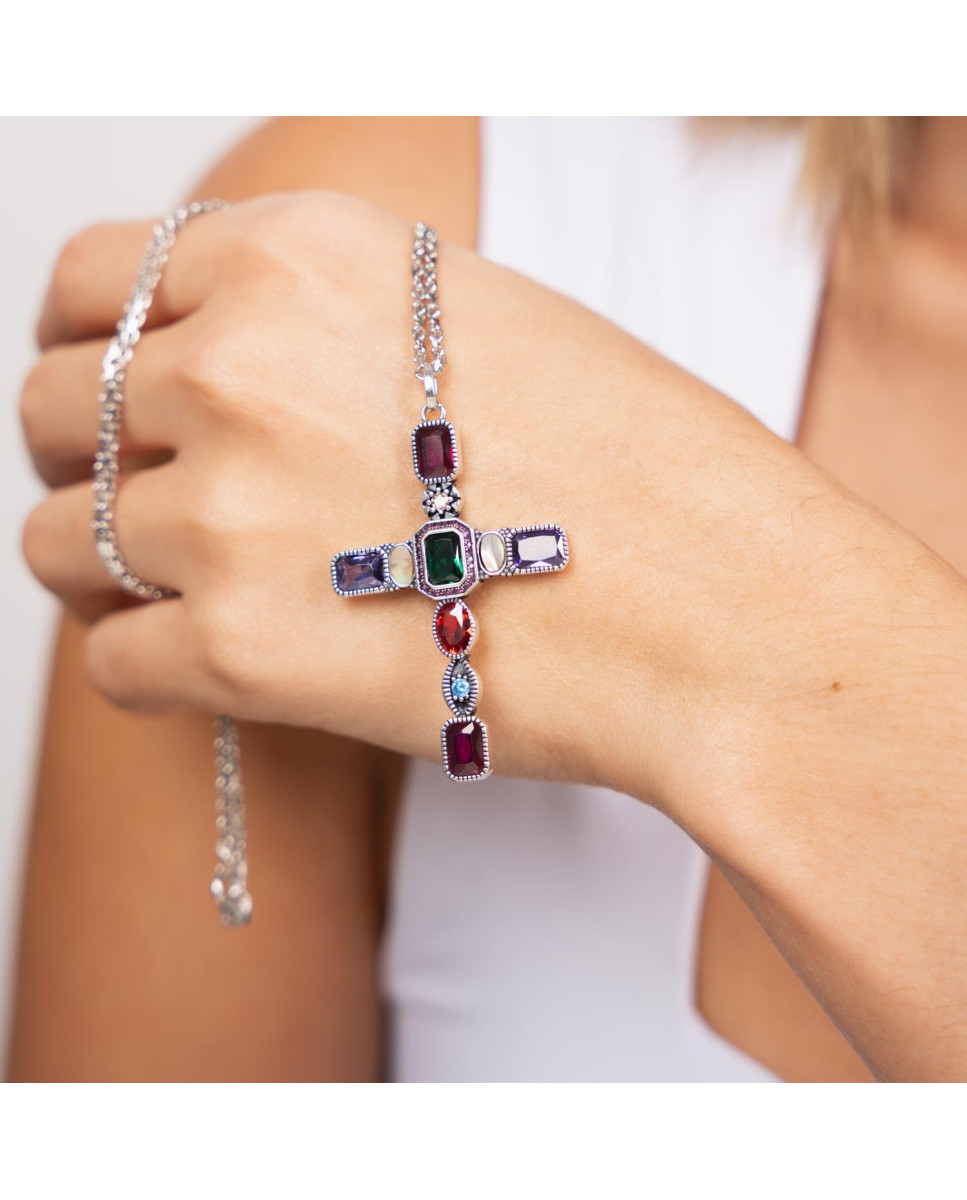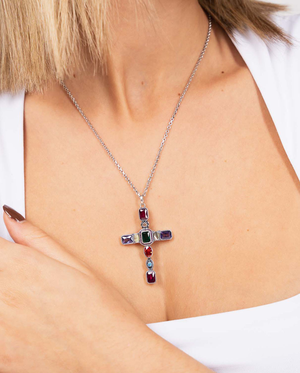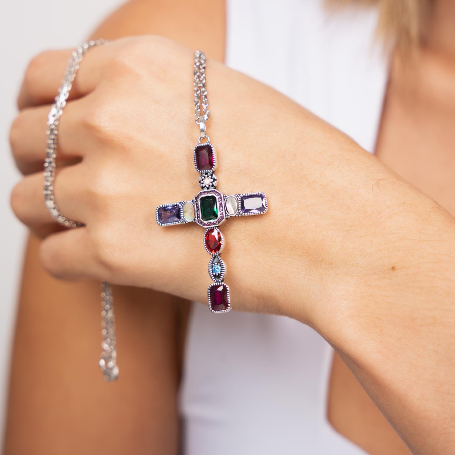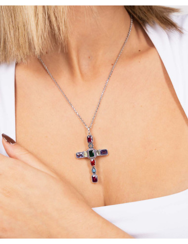 Colgante de plata de ley 925 bañada en rodio con cruz de 32 mm x 47 mm (ancho por alto) y circonitas multicolor en su interior. Cadena tipo rolo de 2 mm de grosor y 50 cms de largo, cierre de mosquetón.
