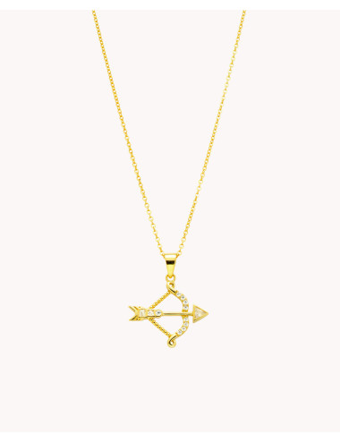 Colgante de plata de ley 925 bañada en oro 18K en forma cupido con corazón de 10 mm de circonitas blancas engastadas y flecha de 20 mm con circonitas en baguette, cadena de 42 cms más 3 cms de extensión y cierre de mosquetón.