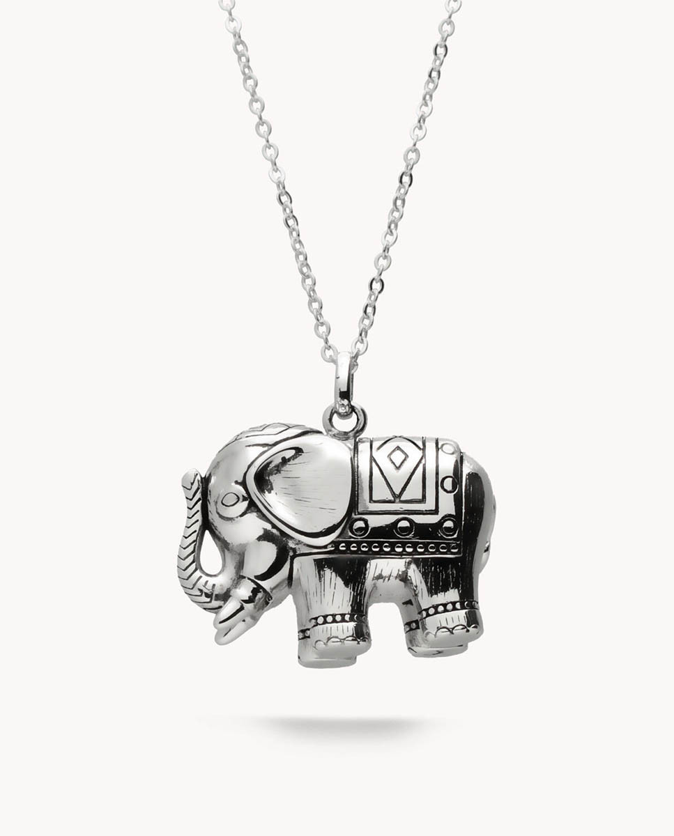 Colgante de plata de ley 925 bañada en rodio con elefante. Cadena con cierre de mosquetón y largo a dos alturas (42 cms y 45 cms).