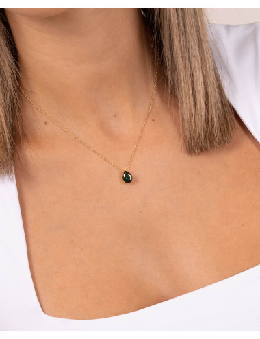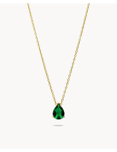 Colgante de plata de ley 925 bañada en oro 18K con circonita en forma de gota color esmeralda de 7 mm x 9 mm (ancho por alto), largo de 40 cms más 5,5 cms de alargador y cierre de mosquetón.