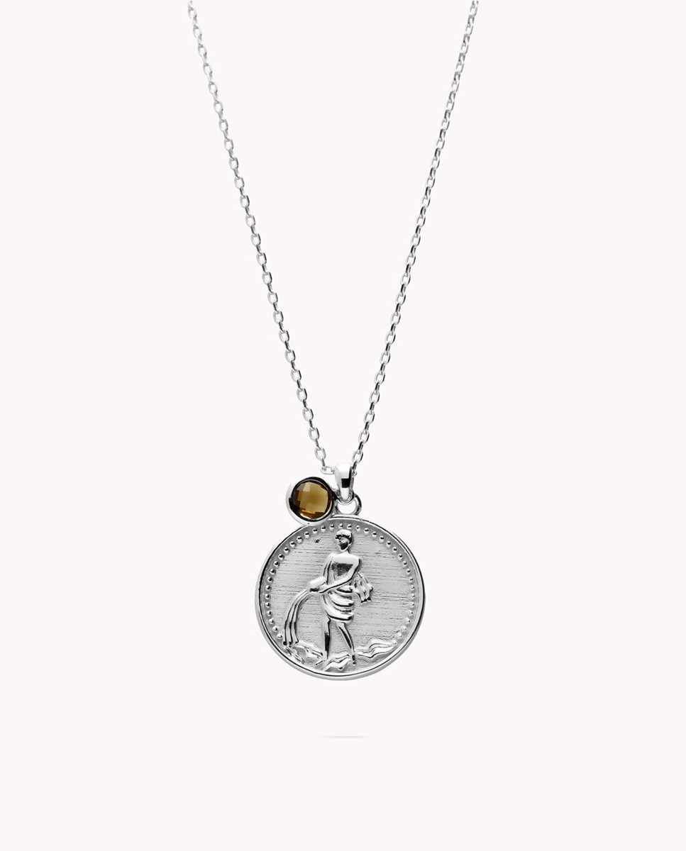 Colgante de plata de ley 925 bañada en rodio con horóscopo de Acuario en chapa redonda de 20 mm de diámetro y circonita color marrón de 5 mm de diámetro, cadena de 40 cms más 10 cms de alargador y cierre de mosquetón.