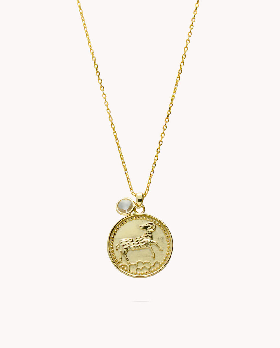 Colgante de plata de ley 925 bañada en oro 18K con horóscopo de Aries en chapa redonda de 20 mm de diámetro y circonita color blanca de 5 mm de diámetro, cadena de 40 cms más 10 cms de alargador y cierre de mosquetón.