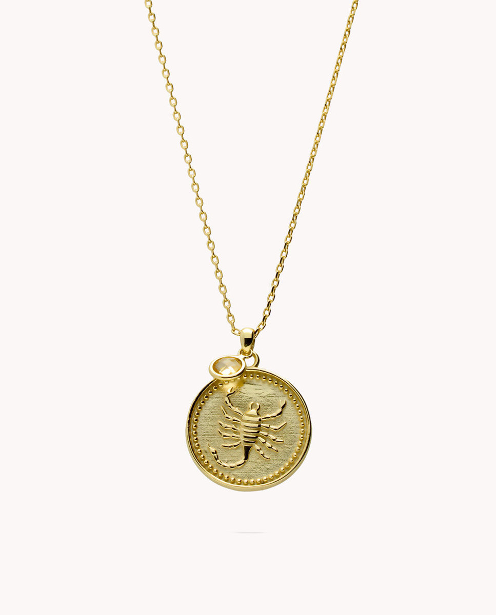 Colgante de plata de ley 925 bañada en oro 18K con horóscopo de Escorpio en chapa redonda de 20 mm de diámetro y circonita color champagne de 5 mm de diámetro, cadena de 40 cms más 10 cms de alargador y cierre de mosquetón.
