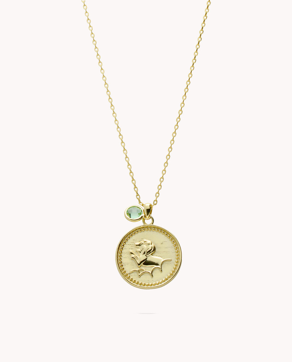 Colgante de plata de ley 925 bañada en oro 18K con horóscopo de Leo en chapa redonda de 20 mm de diámetro y circonita color peridot de 5 mm de diámetro, cadena de 40 cms más 10 cms de alargador y cierre de mosquetón.