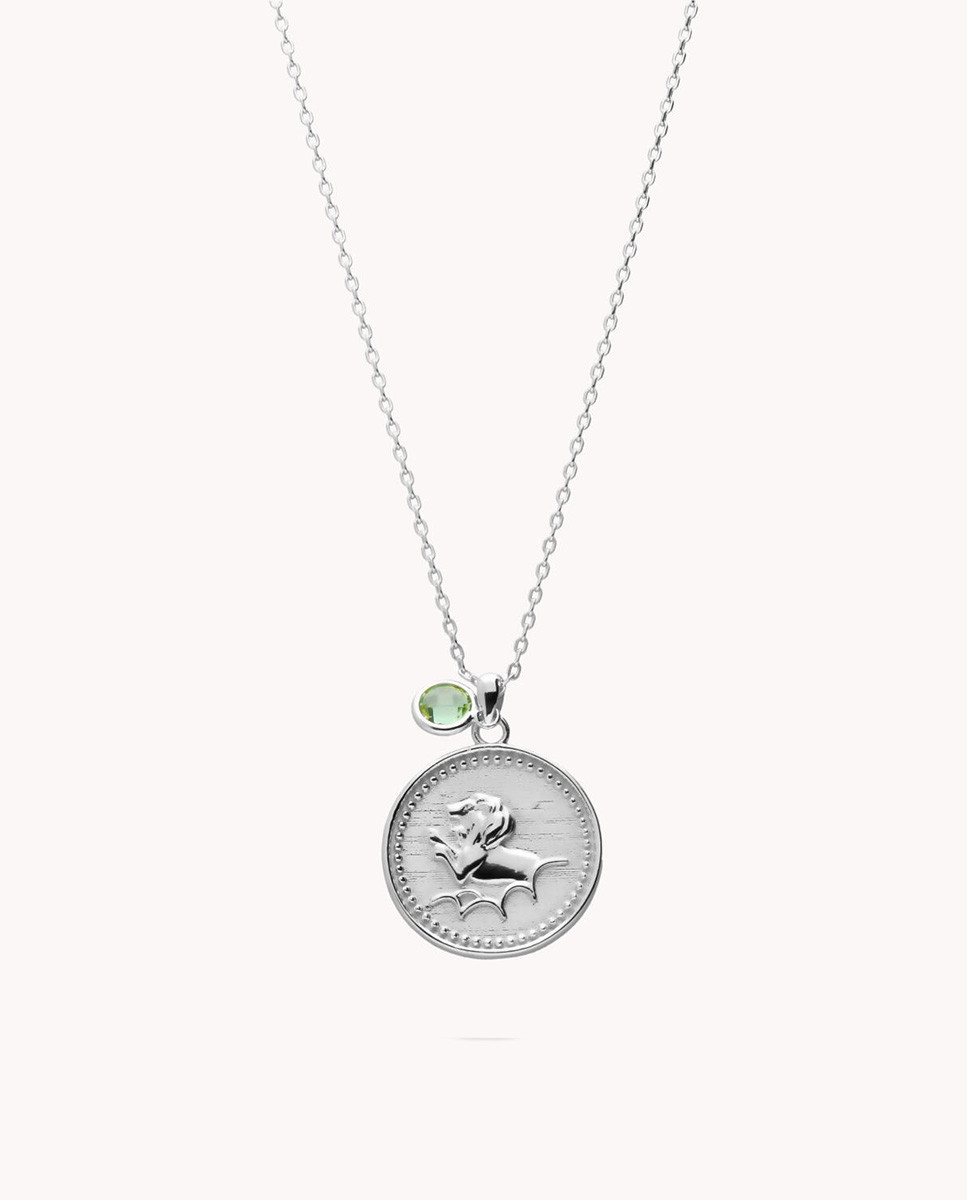 Colgante de plata de ley 925 bañada en rodio con horóscopo de Leo en chapa redonda de 20 mm de diámetro y circonita color peridot de 5 mm de diámetro, cadena de 40 cms más 10 cms de alargador y cierre de mosquetón.