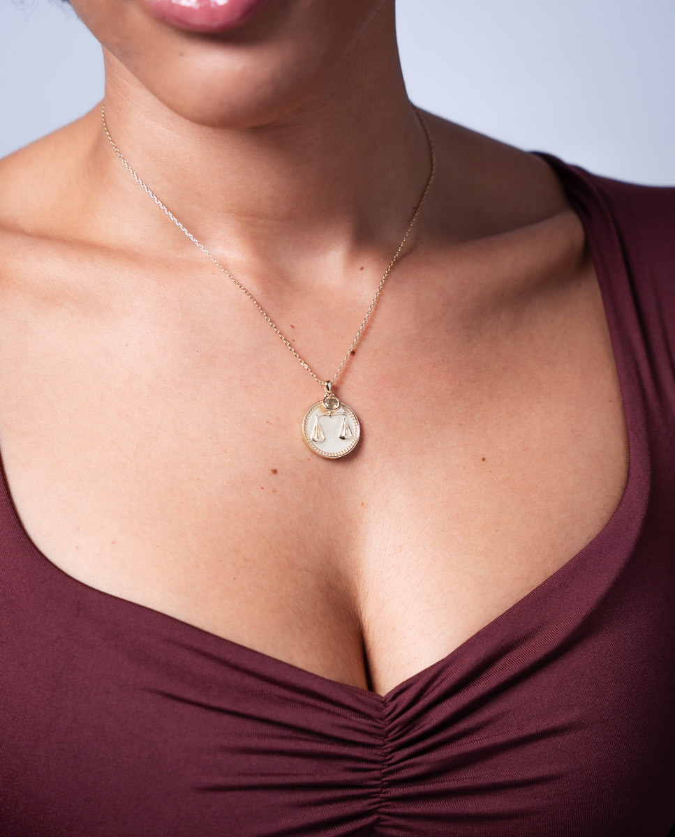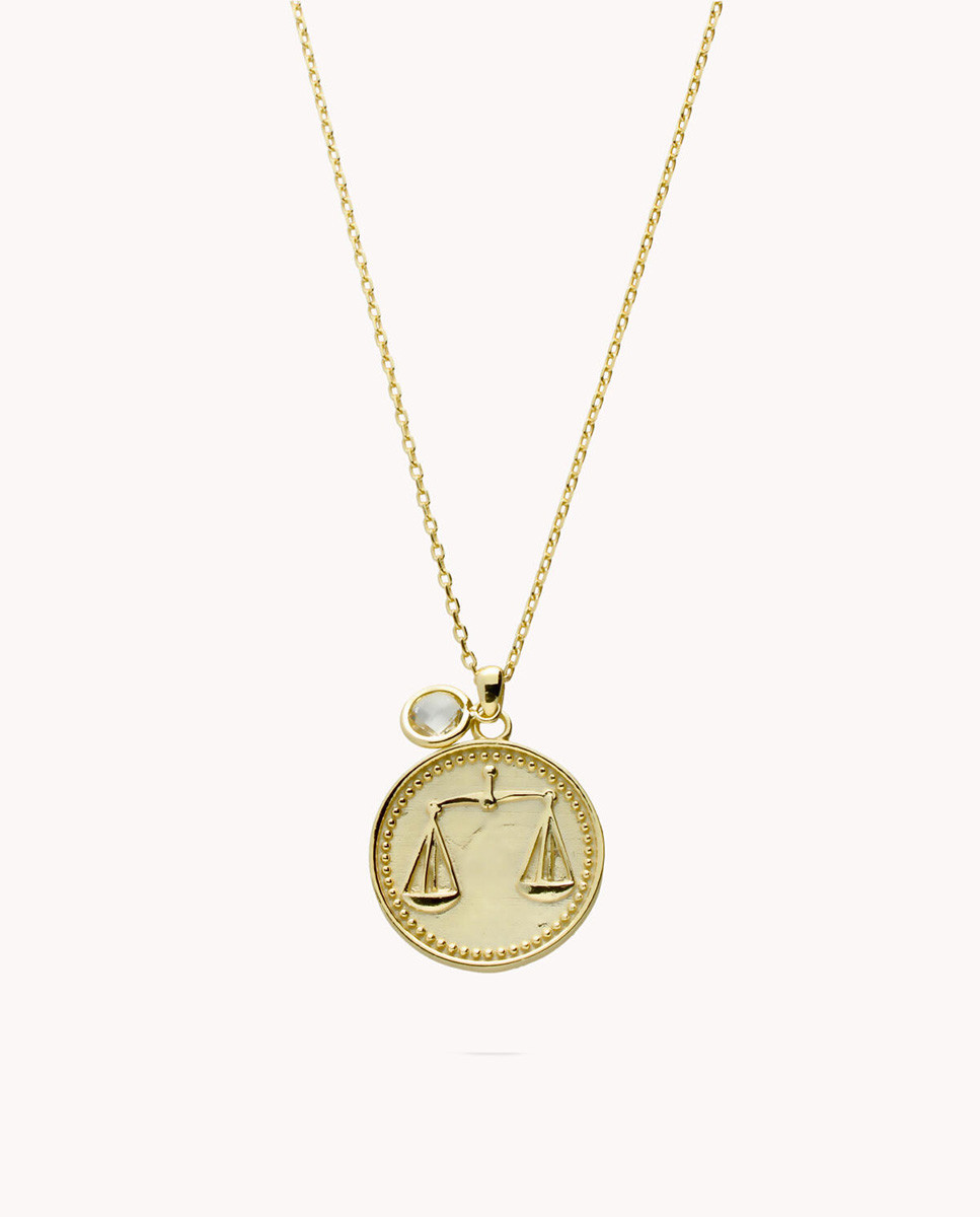 Colgante de plata de ley 925 bañada en oro 18K con horóscopo de Libra en chapa redonda de 20 mm de diámetro y circonita color blanca de 5 mm de diámetro, cadena de 40 cms más 10 cms de alargador y cierre de mosquetón.
