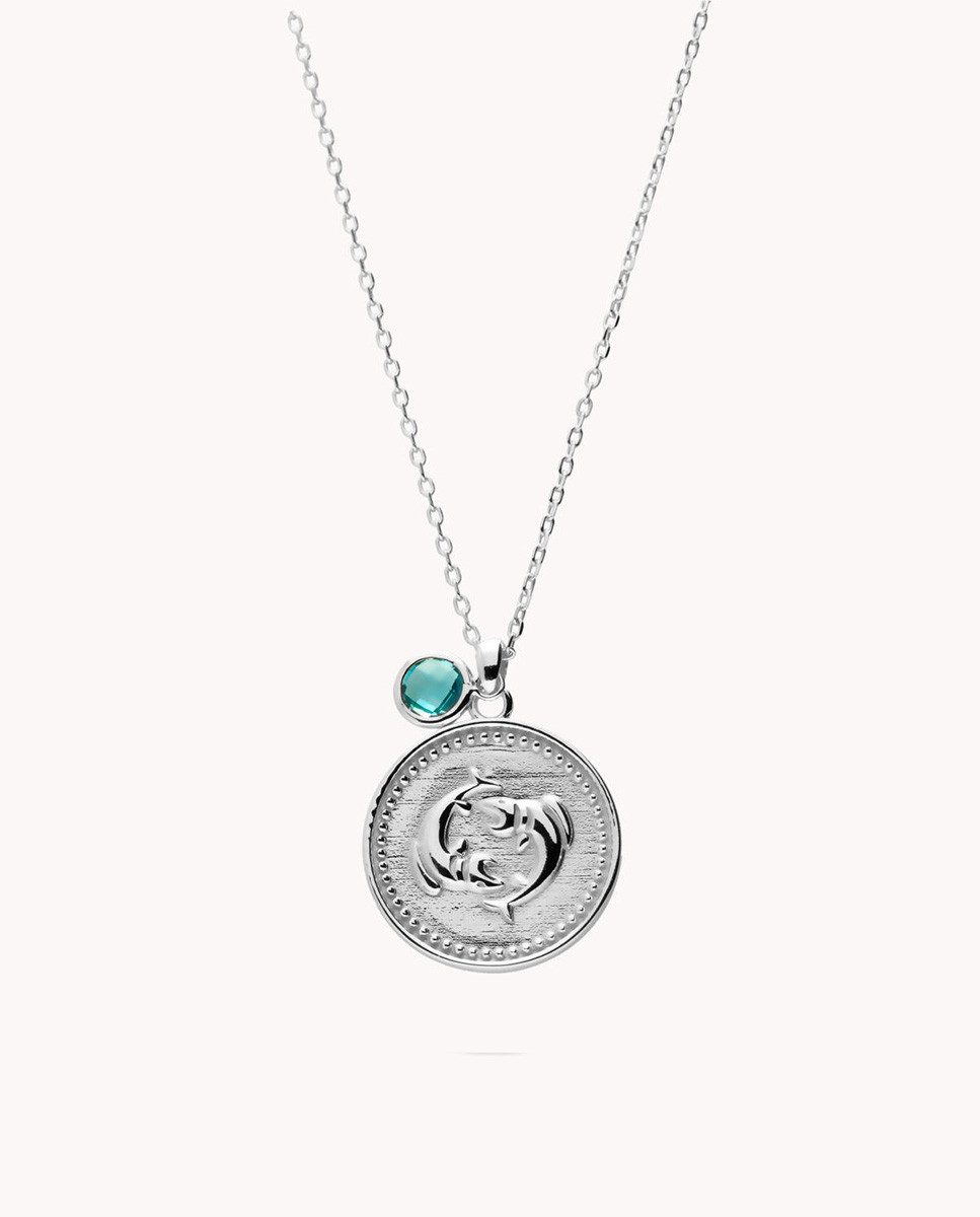 Colgante de plata de ley 925 bañada en rodio con horóscopo de Piscis en chapa redonda de 20 mm de diámetro y circonita color aguamarina de 5 mm de diámetro, cadena de 40 cms más 10 cms de alargador y cierre de mosquetón.