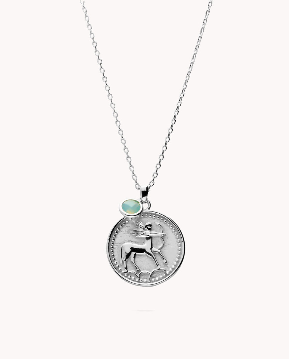 Colgante de plata de ley 925 bañada en rodio con horóscopo de Sagitario en chapa redonda de 20 mm de diámetro y circonita color aguamarina de 5 mm de diámetro, cadena de 40 cms más 10 cms de alargador y cierre de mosquetón.