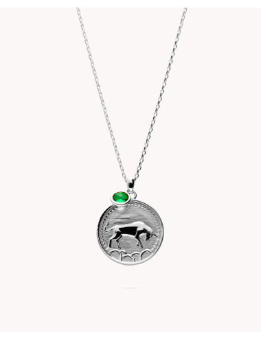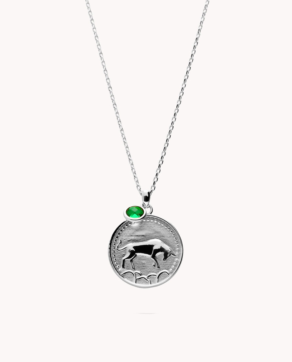 Colgante de plata de ley 925 bañada en rodio con horóscopo de Tauro en chapa redonda de 20 mm de diámetro y circonita color esmeralda de 5 mm de diámetro, cadena de 40 cms más 10 cms de alargador y cierre de mosquetón.
