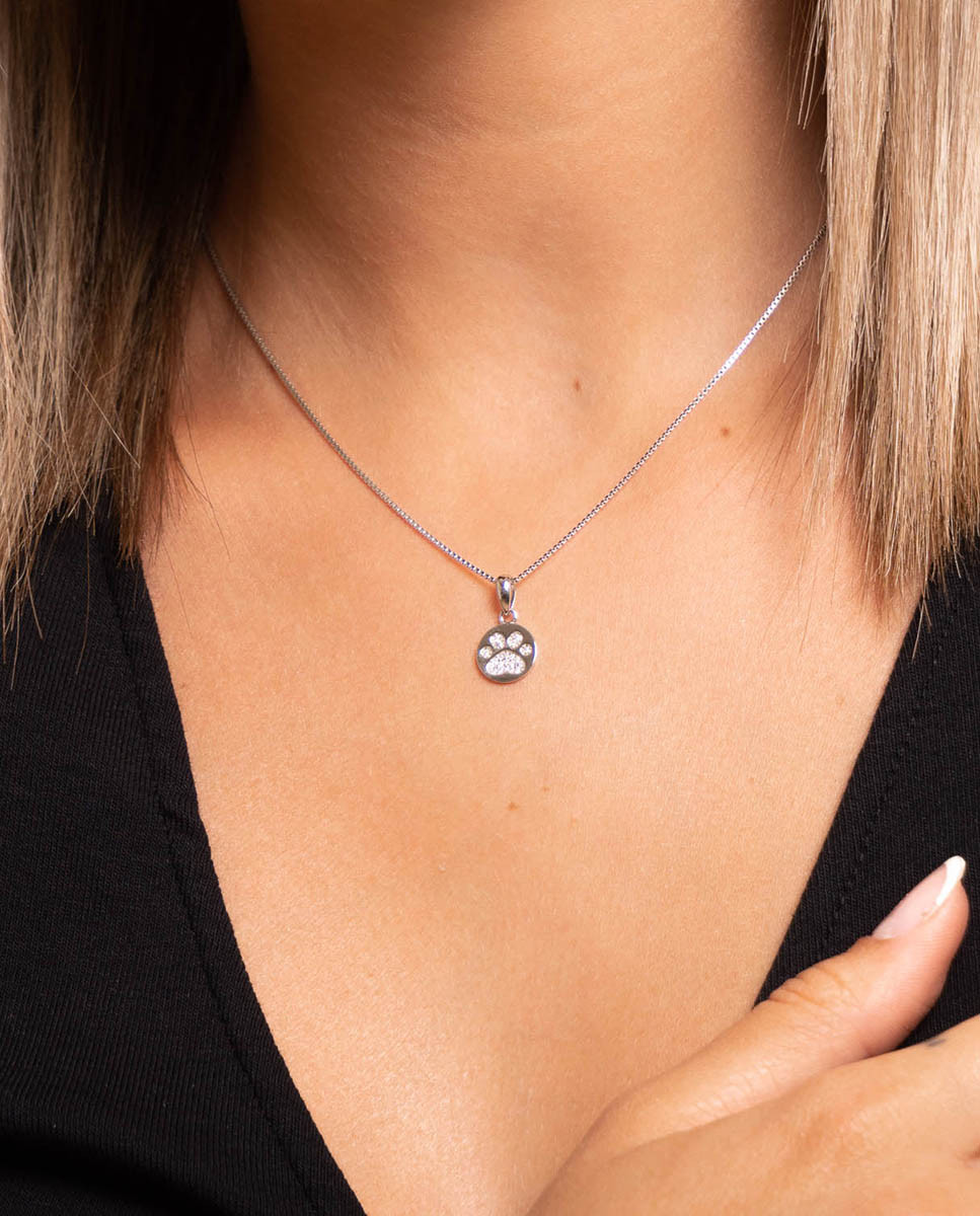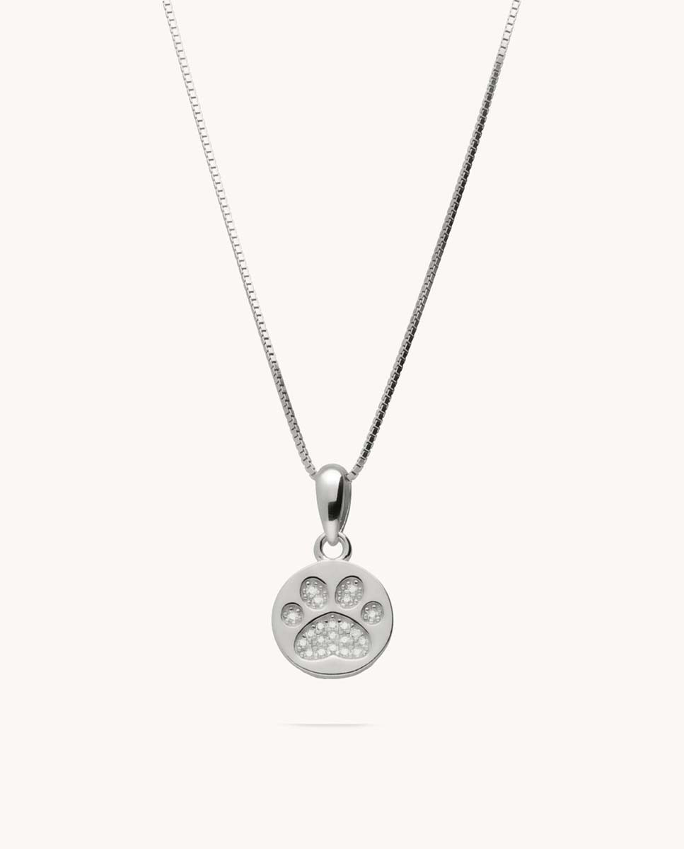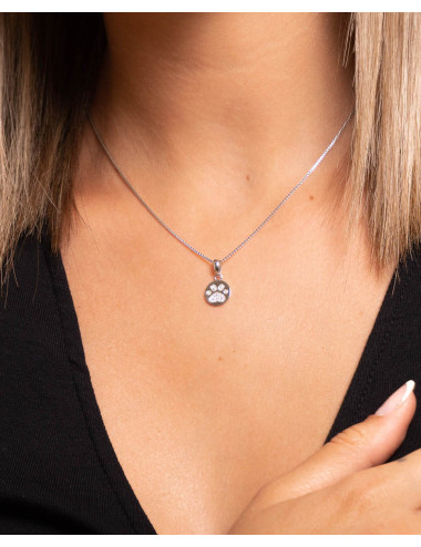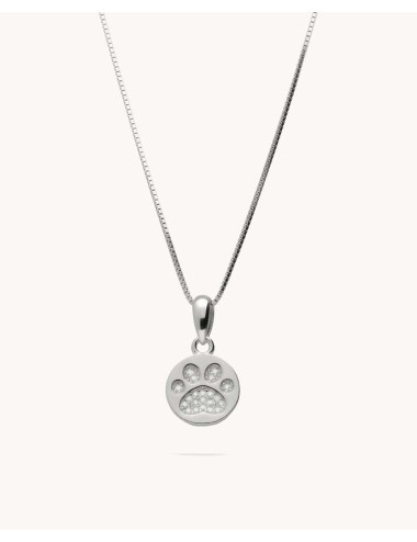 Colgante de plata de ley 925 bañada en rodio con chapa de 9 mm de diámetro y en su interior huella de perro con circonitas blancas. Cadena de 40 cms más 5 cms de alargador y cierre tipo reasa.
